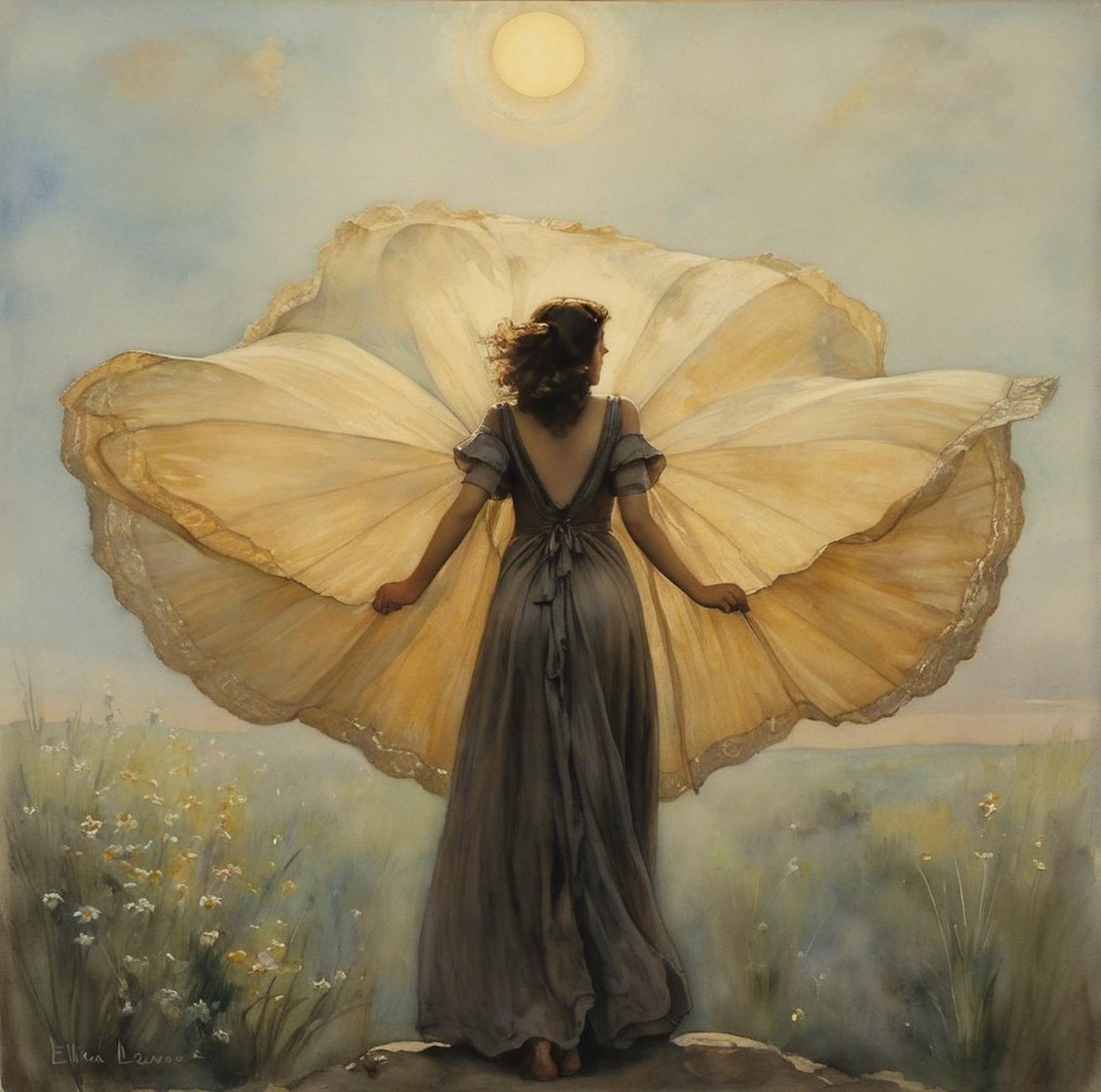 A woman stands by a serene lake, her flowing dress billowing in the gentle breeze. The soft sunlight casts a warm glow, highlighting the peaceful surroundings and her graceful silhouette.