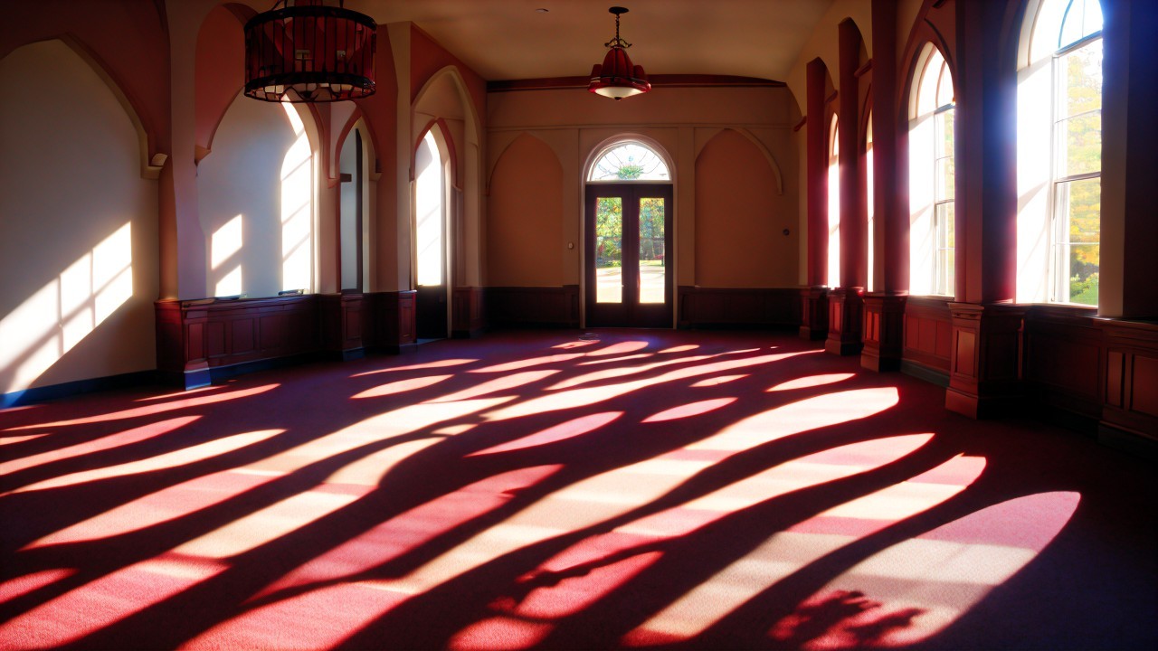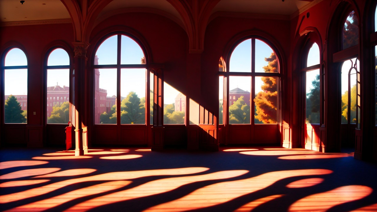 A vibrant sunset casts warm hues through grand, arched windows, illuminating a beautifully detailed courtyard with red brick buildings and lush trees, creating a serene, inviting atmosphere.