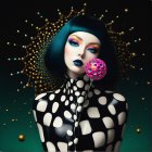 A striking figure with a bold, geometric black-and-white pattern on her skin, she has vibrant blue hair and dramatic makeup. The background features intricate designs and circular motifs.