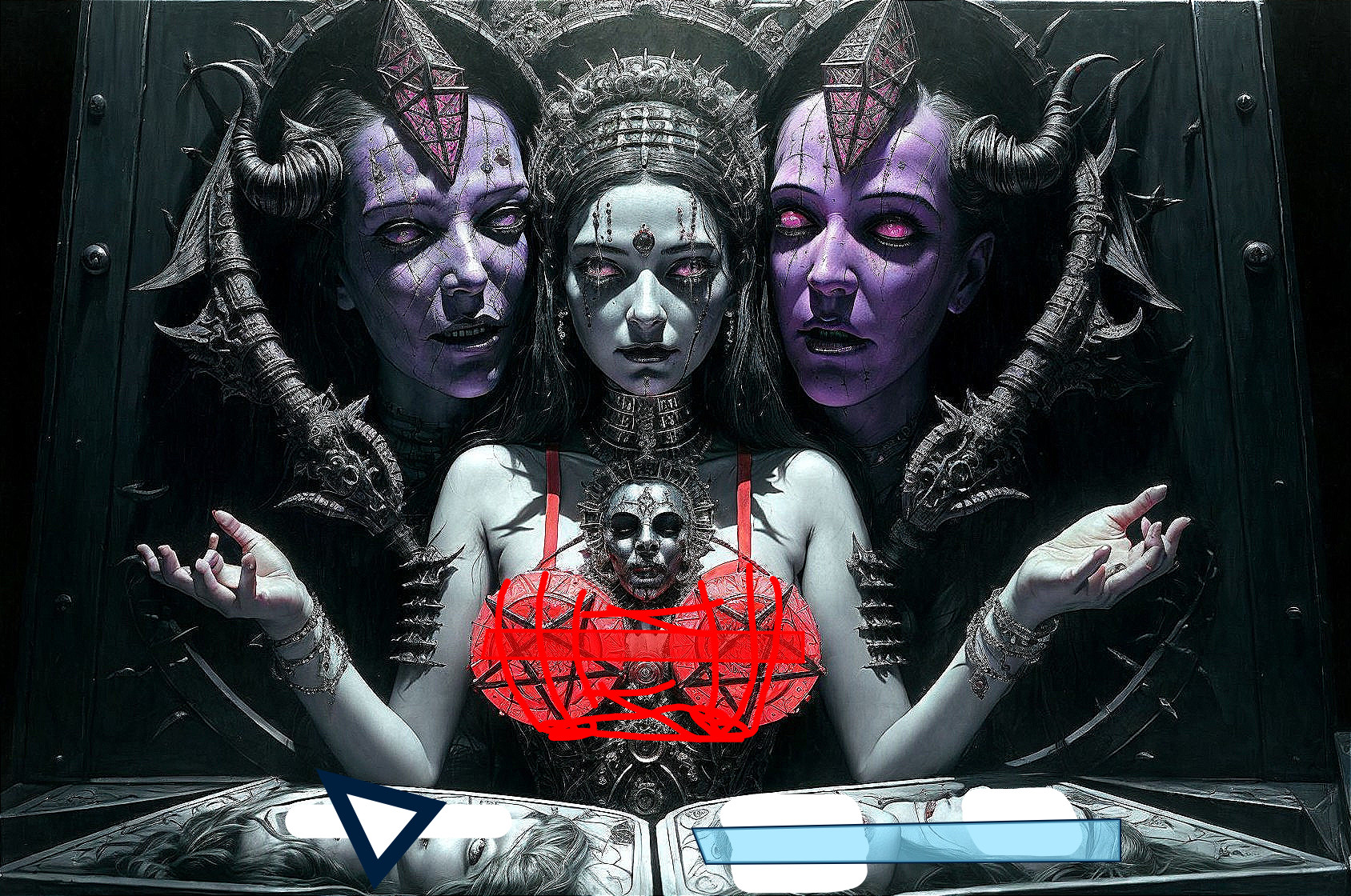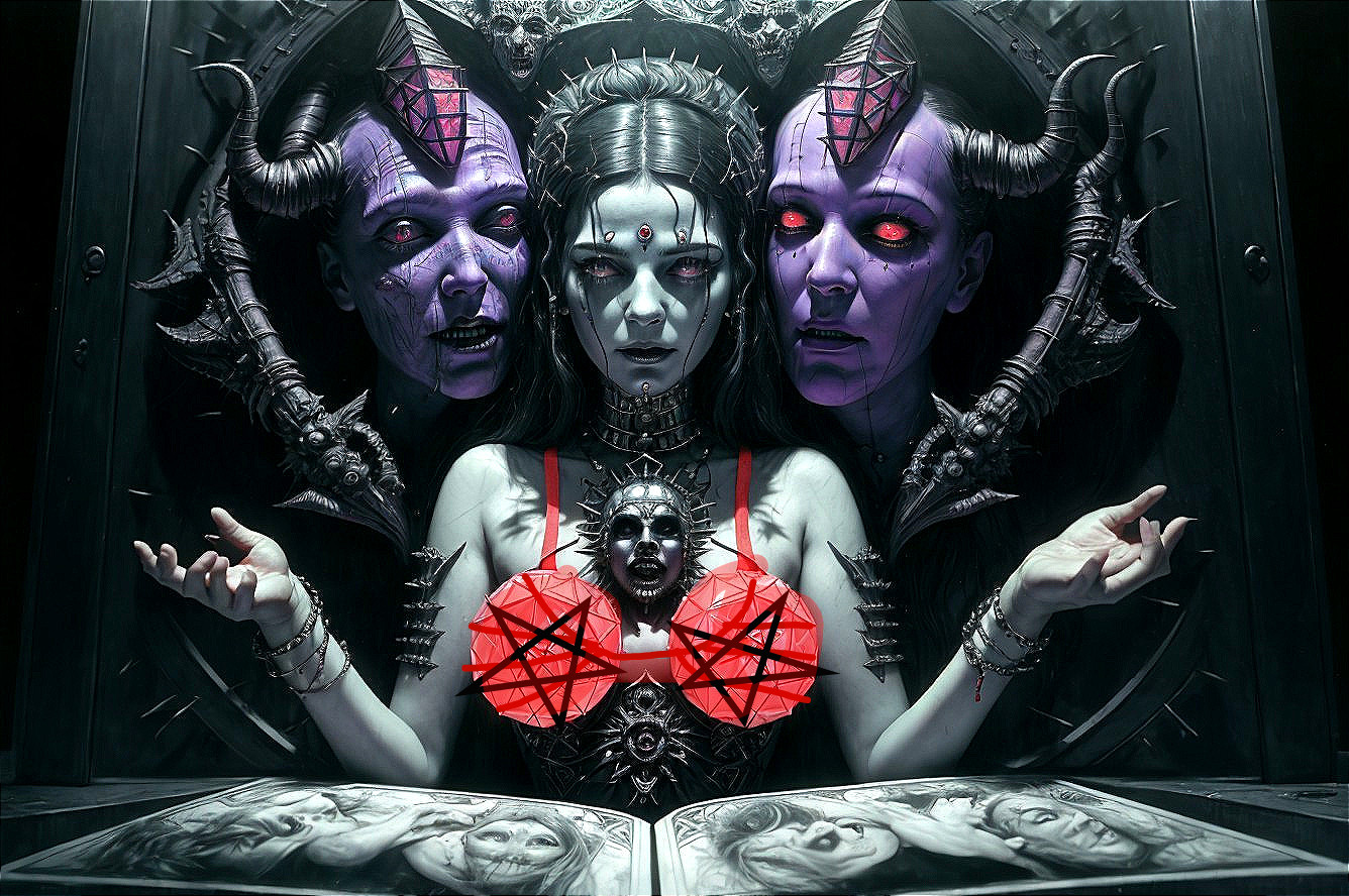 A trio of eerie, adorned figures with skulls and mystical symbols, exuding a dark, occult ambiance.