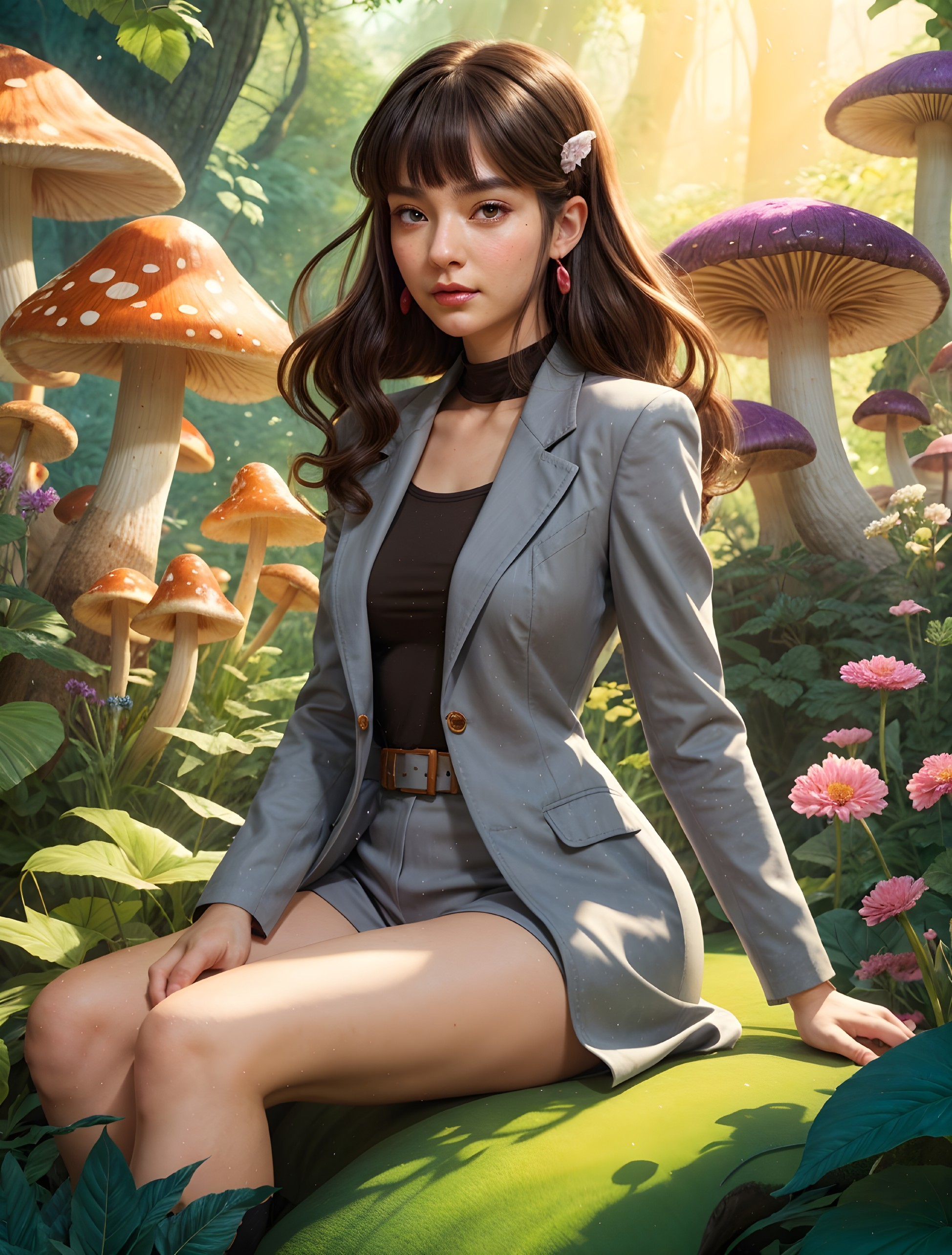 A woman in a stylish gray suit sits gracefully on vibrant green foliage, surrounded by oversized mushrooms and colorful flowers in a magical forest setting, illuminated by soft sunlight.