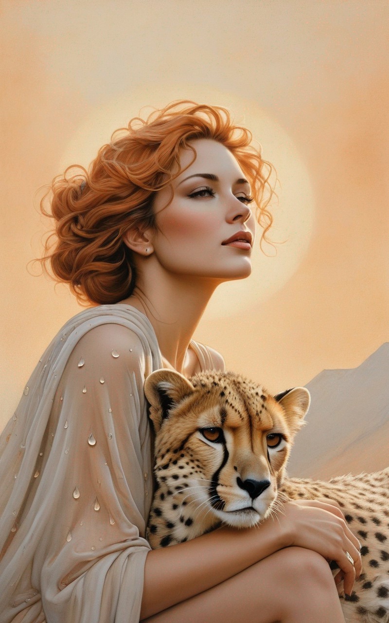 A stylized image of a woman with flowing hair, sunglasses, and earrings, posing elegantly with a cheetah against a backdrop of a large sun.