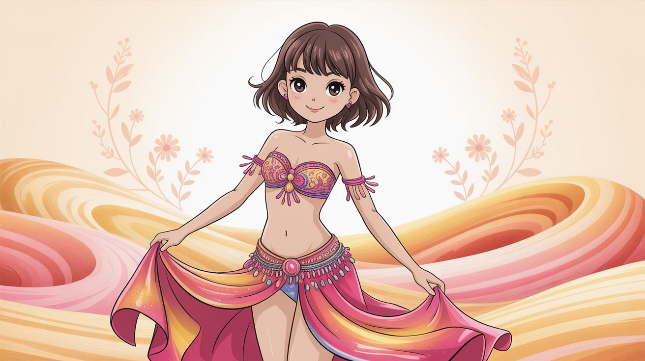 A charming anime character showcases her lively spirit as a belly dancer, adorned in a vibrant strapless swimsuit. Her playful movements and colorful attire create a captivating and joyful atmosphere.