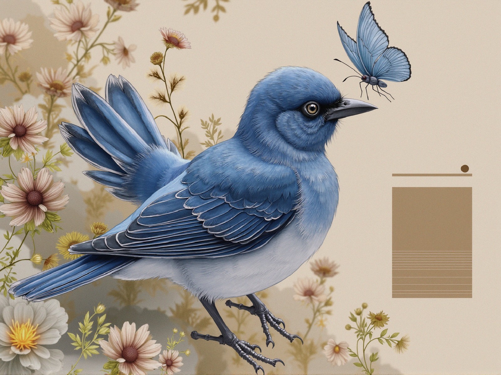 A bluebird perches on a branch among vibrant yellow flowers, with a delicate blue butterfly fluttering above, creating a serene and playful scene in a soft pastel background.