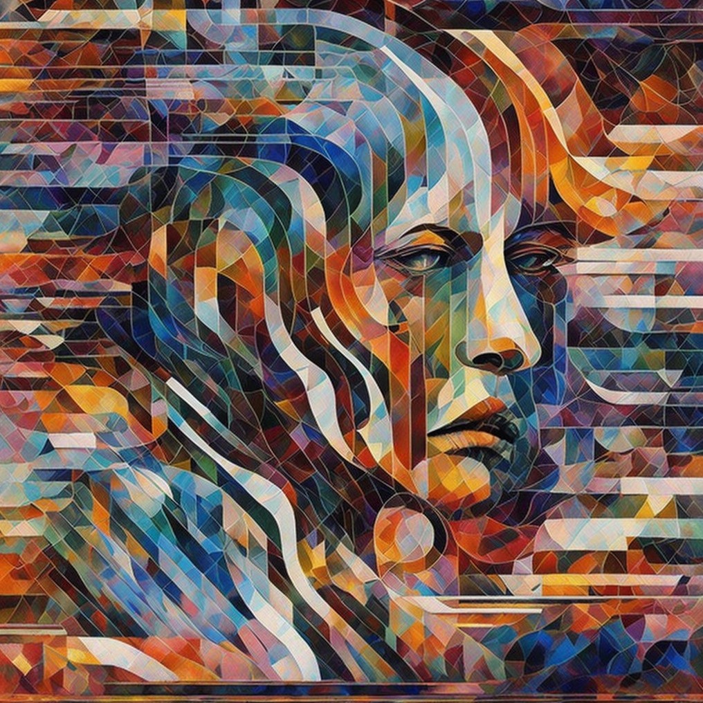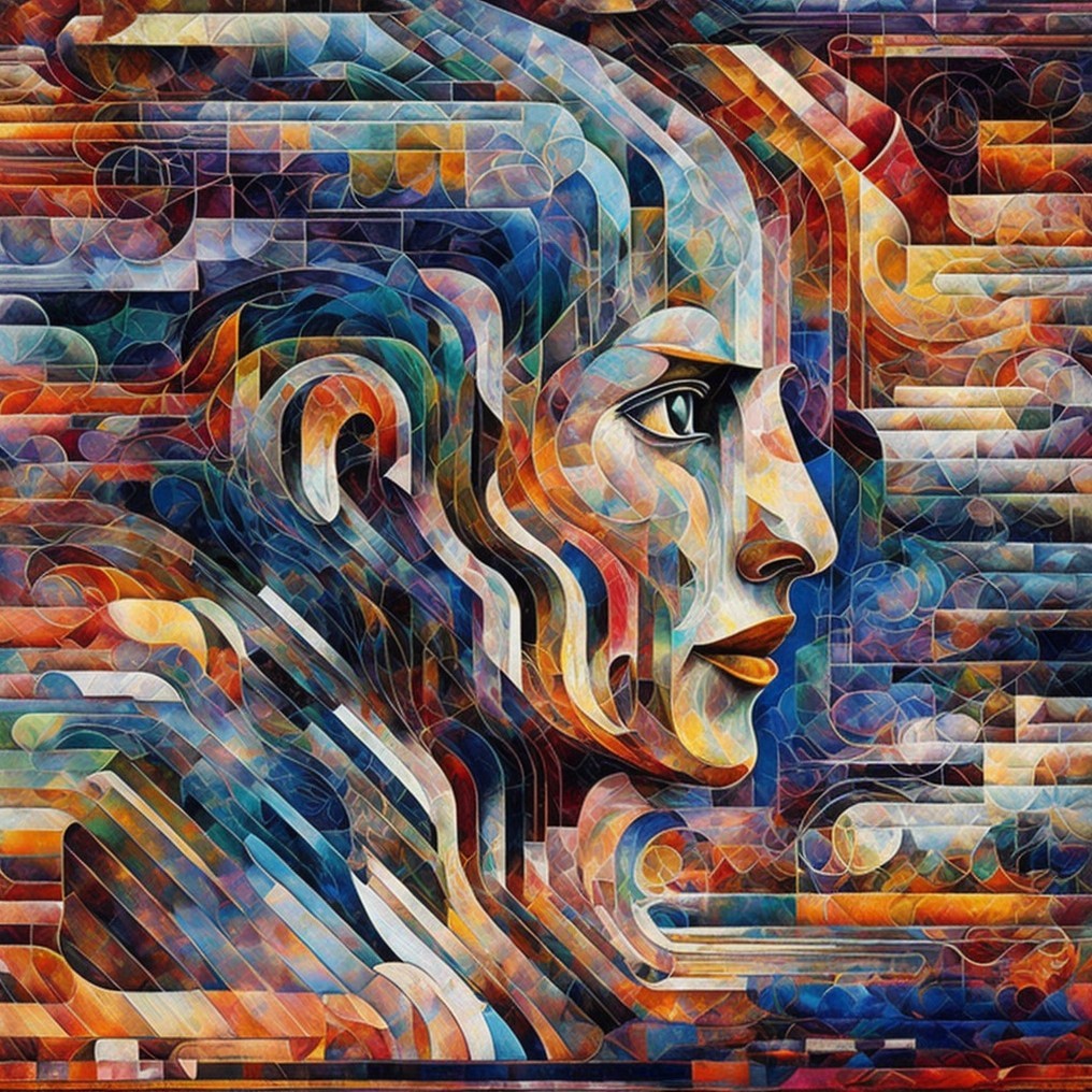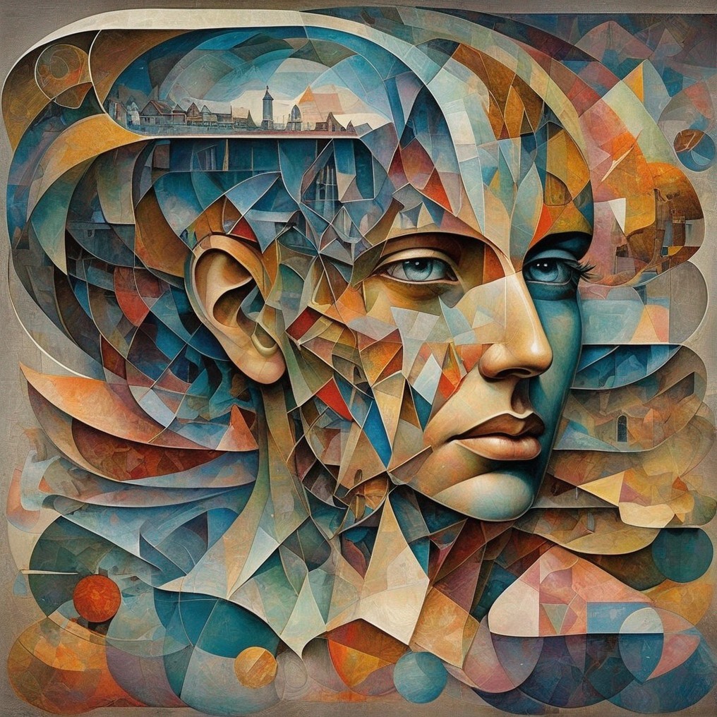 A surreal art piece depicting a profile and frontal view of a face merged with a detailed cityscape in warm, earthy tones.