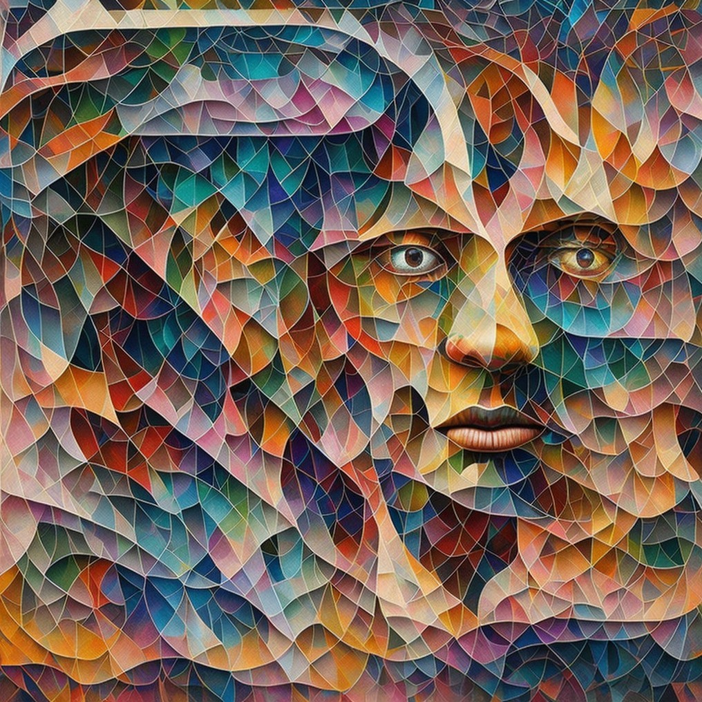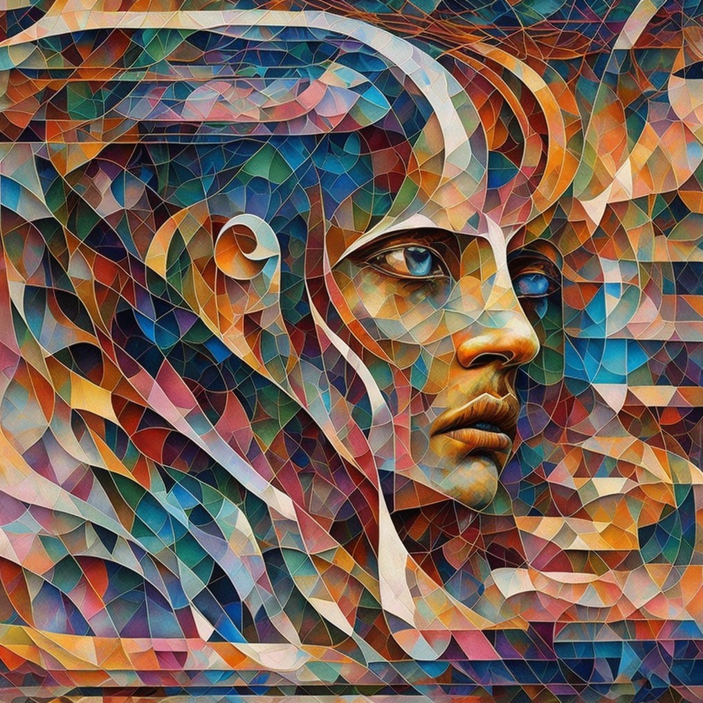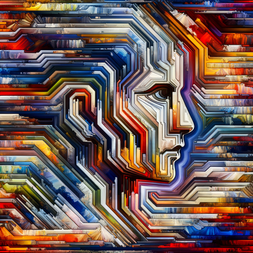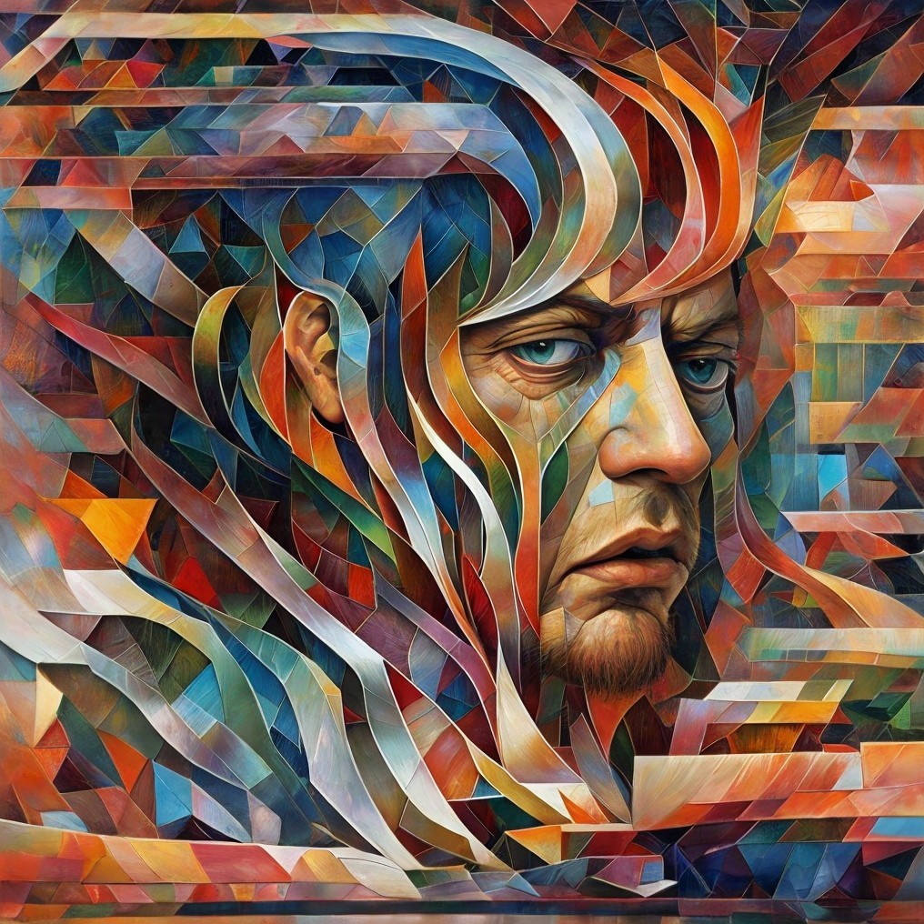 A surreal art piece depicting a profile and frontal view of a face merged with a detailed cityscape in warm, earthy tones.