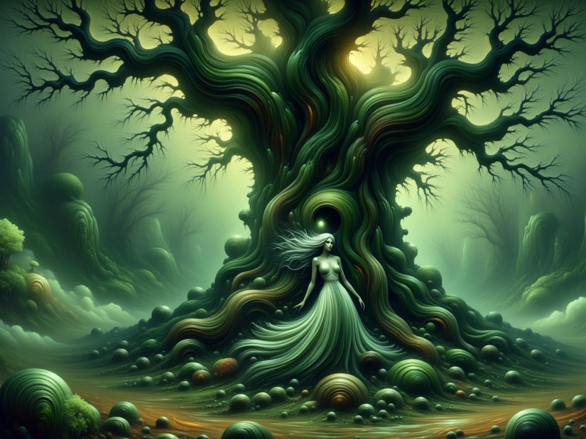 A woman in a flowing green dress stands gracefully by a towering, ancient tree covered in lush moss, surrounded by a mystical forest filled with soft, diffused light.