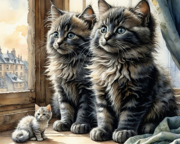 A whimsical scene featuring a striped cat sitting amidst a vibrant landscape of rolling hills, colorful flowers, and stylized trees, all under a bright, cheerful sky.
