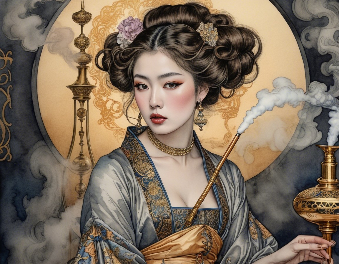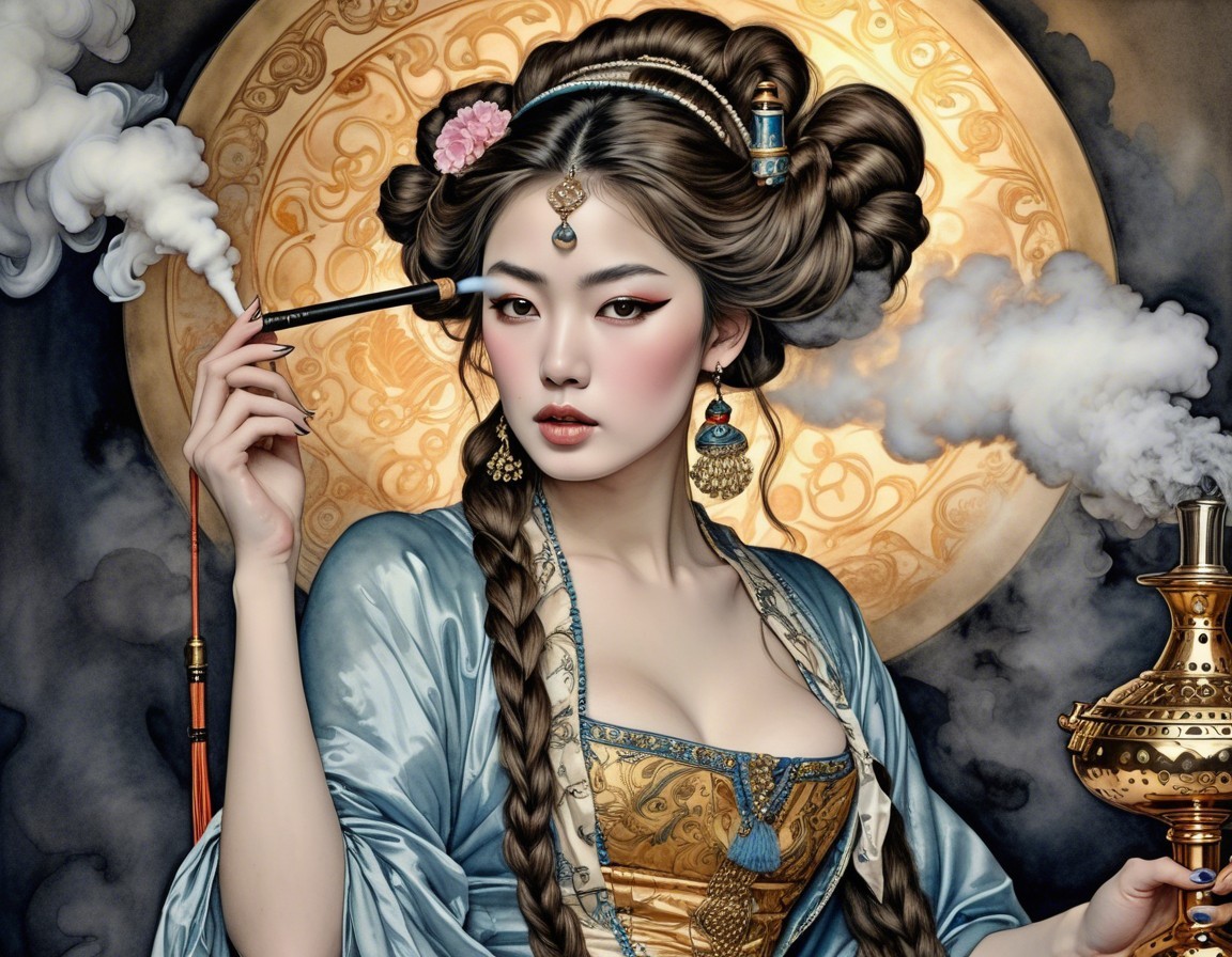 A woman in an elegant blue gown sits gracefully among ornate brass hookahs, surrounded by wisps of smoke and intricate decor, evoking a serene, regal atmosphere.