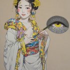 A young woman in a colorful, traditional outfit holds a decorative fan featuring a large eye design. Her hairstyle is adorned with flowers, and she has an inviting smile. The background is neutral.