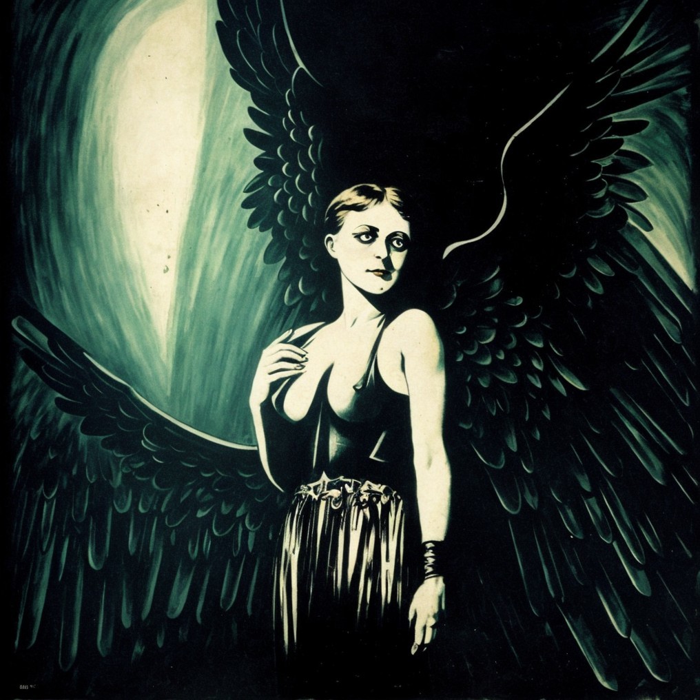A monochrome illustration of an angelic figure with large wings, a serene expression, and draped clothing.