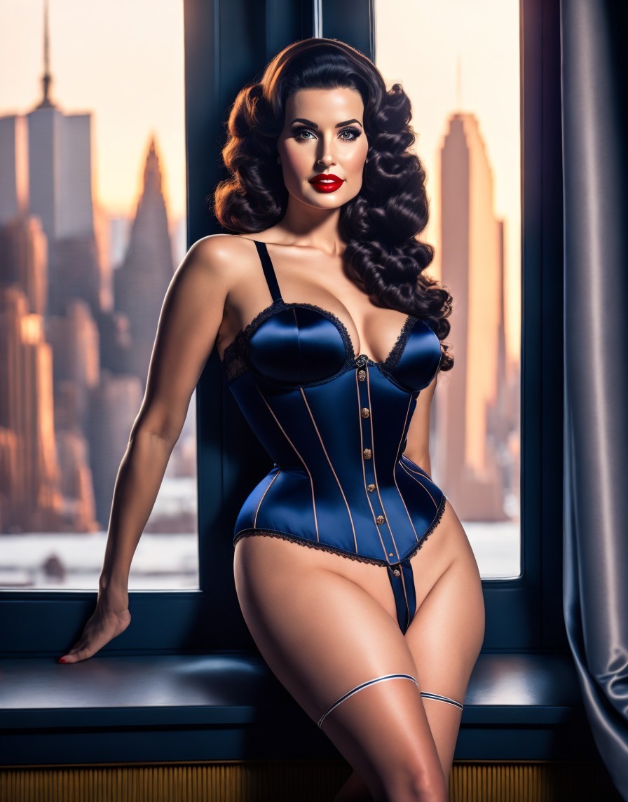 A model in vintage lingerie poses by a window with a cityscape in the background, exuding a classic pin-up style.
