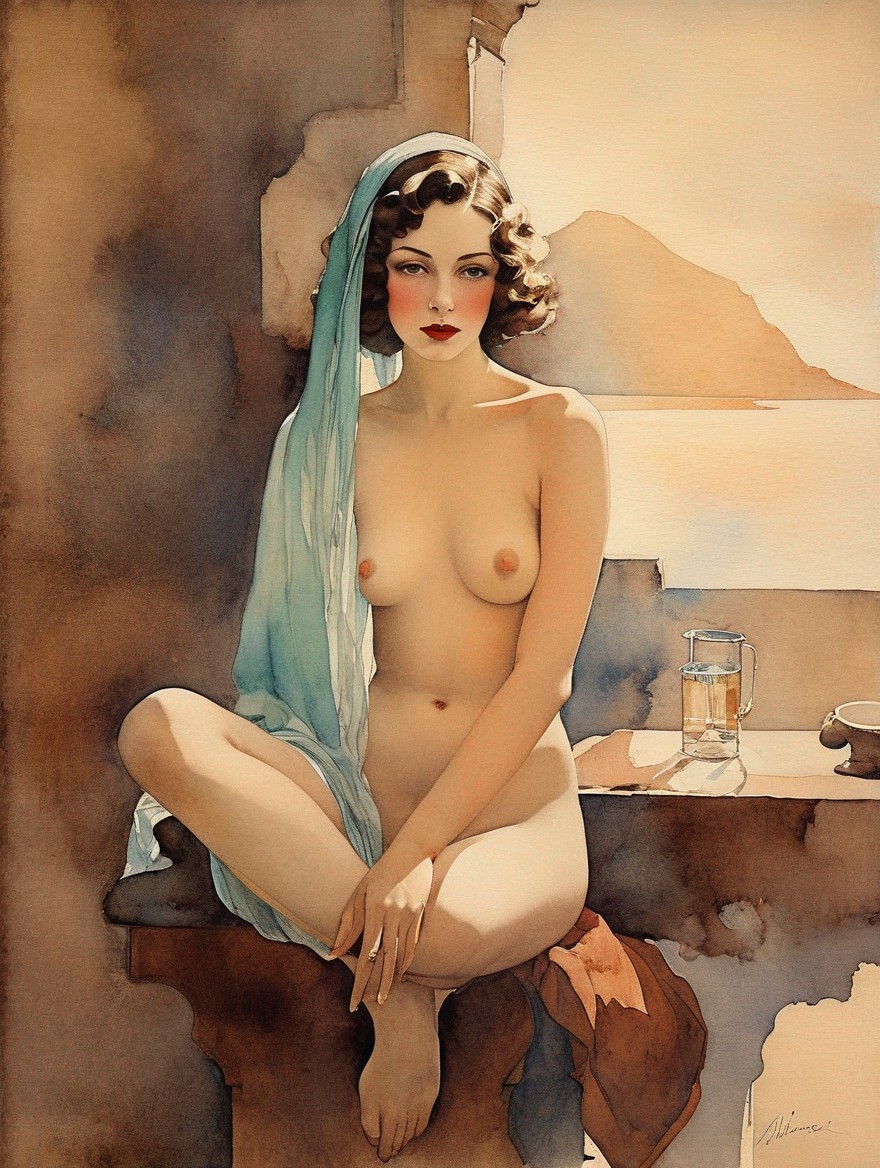 + Prompt:Beautiful woman in the style of WALTER MARTIN BAUMHOFER and rené gruau whimsical, beautiful, poignant, touching. soft watercolor extra water in Art Deco by Annigoni, Egon Schiele, Milo Manara, Botticelli, Catrin Welz-Stein, Jean Metzinger, Klimt, perfect eyes, perfect hands face , highly detailed, complementary colors, hyper detailed. Watercolor and ink splatter, dynamic pose,