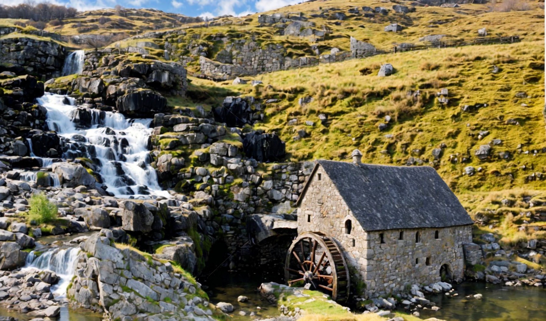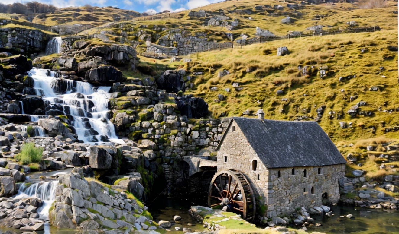 A quaint stone mill with a large water wheel sits beside a cascading waterfall surrounded by rugged terrain and greenery under a clear sky.