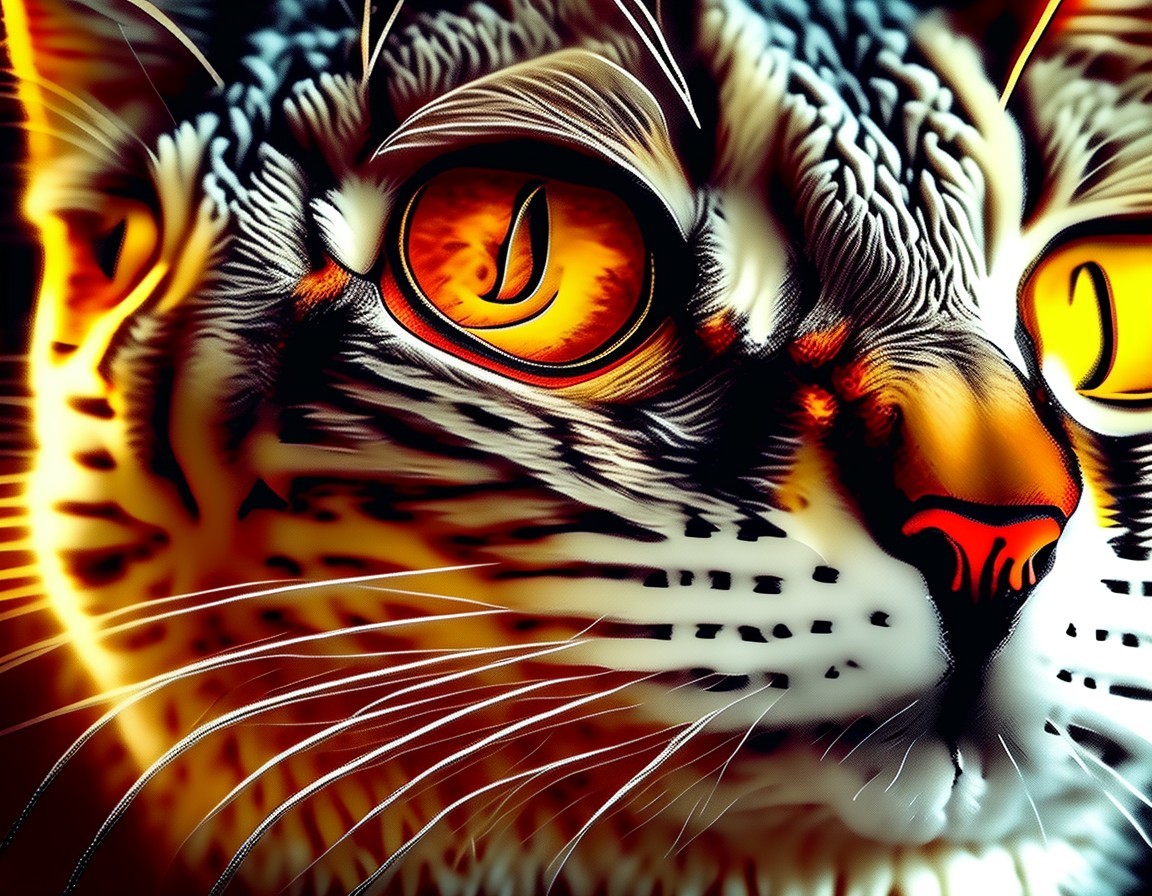 A vibrant, abstract image of a cat's face with exaggerated features and intense orange eyes, set against a dark background.