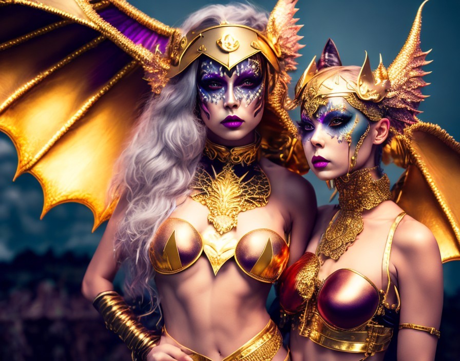 Two individuals in fantasy-inspired makeup and costumes with golden elements and dramatic lighting.