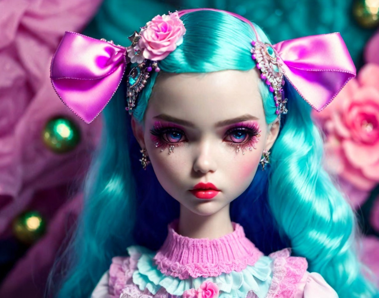 A doll with bright blue hair, adorned with pink bows and roses, detailed makeup, and a ruffled collar, exudes a whimsical charm.