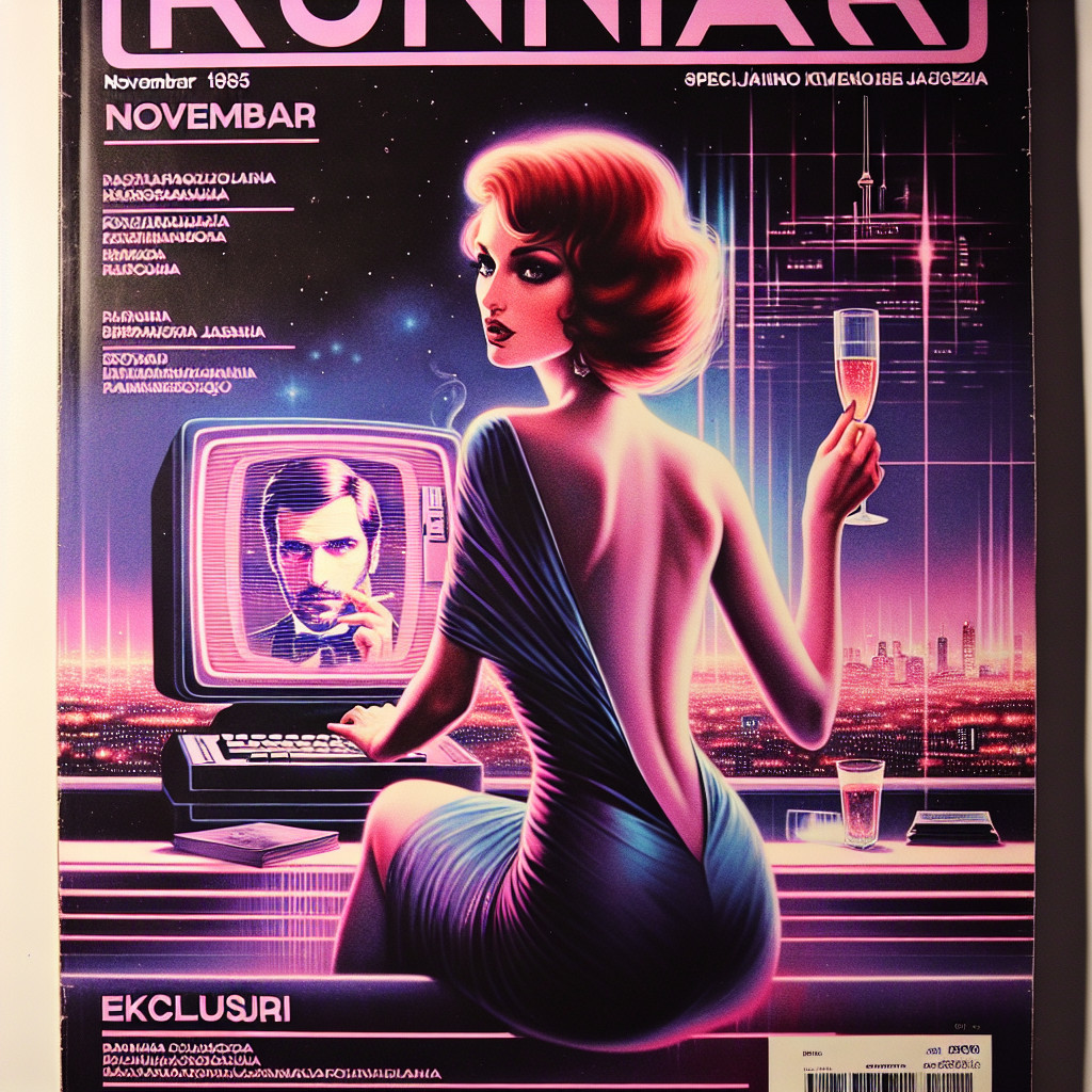 A retrofuturistic magazine cover with a woman in a backless dress sitting at a computer, holding a glass of champagne. The computer screen shows a man with a mustache and a cigarette. The background shows a futuristic city skyline with tall buildings and glowing lights. The artwork is in the style of