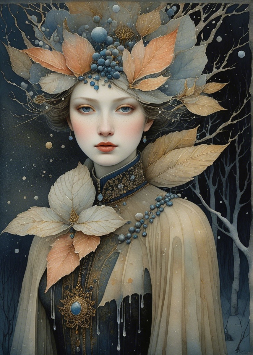 view shot zof a beautiful abrasive of the (cosmic magical mystical winter queen snowflake Queen Anne lace splendor:1.3), by (Arthur Rackham and Edward Deakin, Michael Parkes:0.8), (Tempera and depiction:0.8), 16:9, (painting: