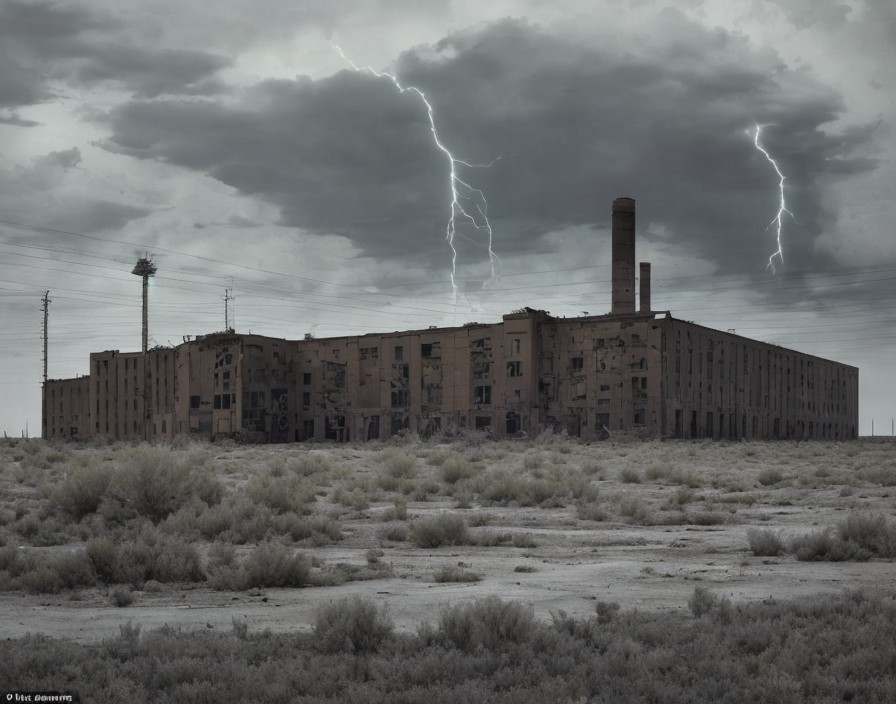 An abandoned industrial building under a stormy sky with lightning bolts.