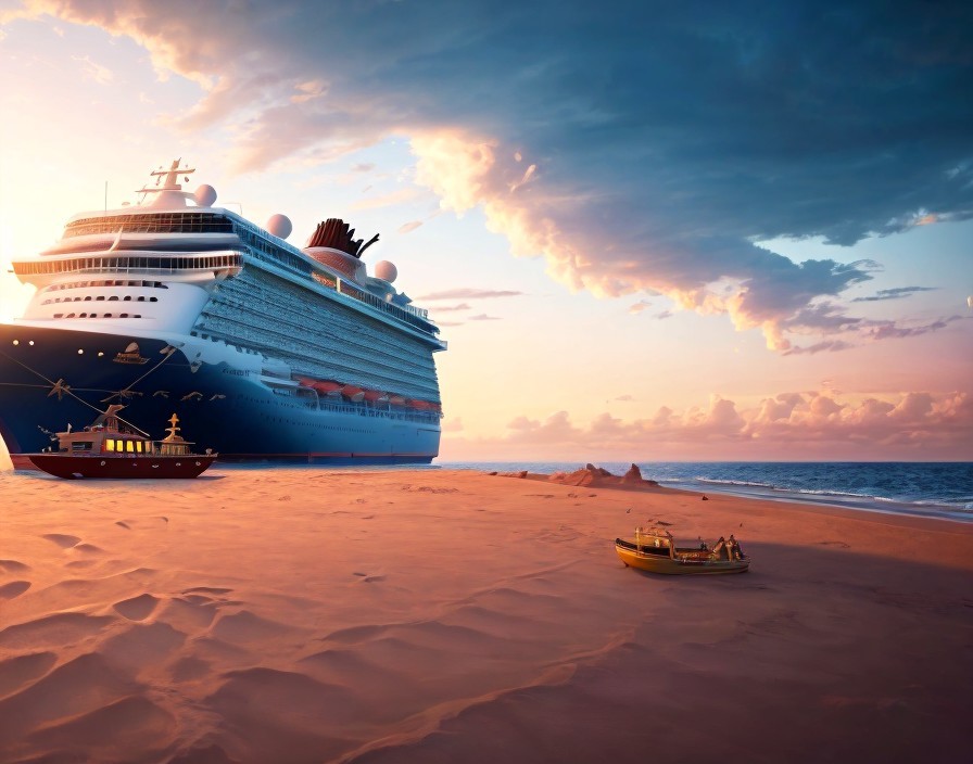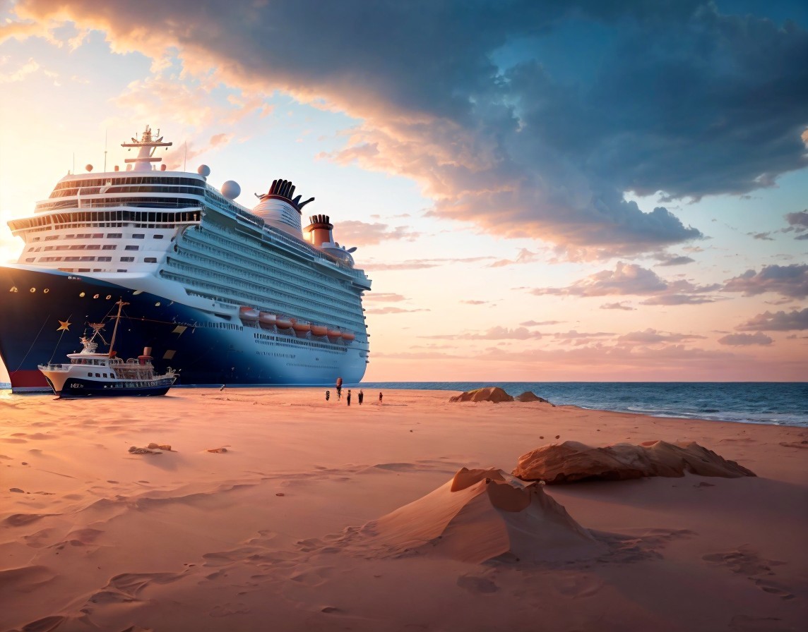 A large cruise ship moored near a sandy beach with a serene sunset sky in the background.