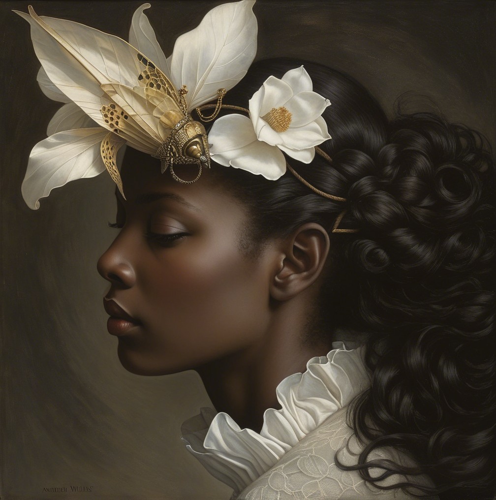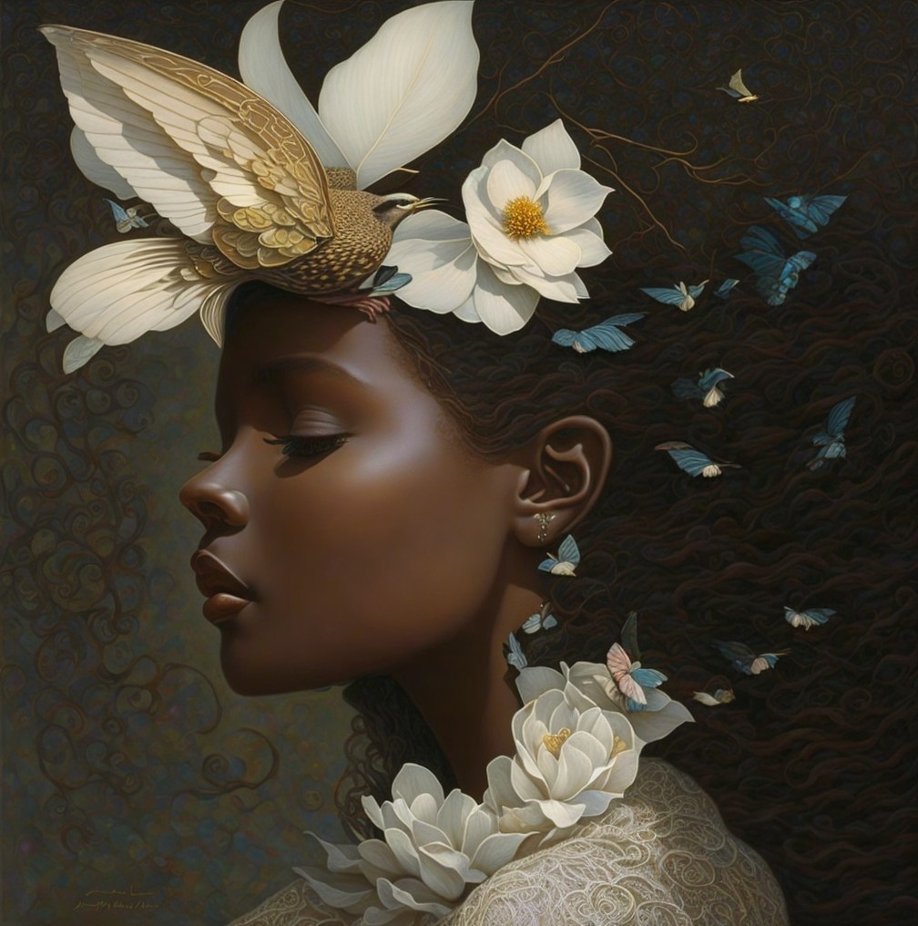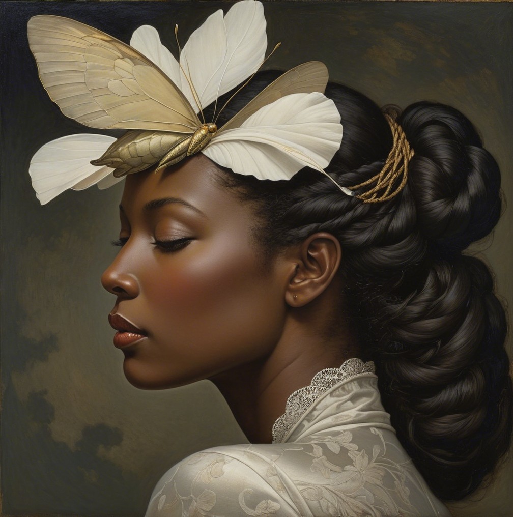 A serene portrait features a woman with long, dark hair adorned with a large white butterfly on her head. She has a graceful profile, wearing a delicate lace collar and a pearl earring.