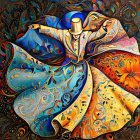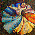 A vibrant, abstract illustration features a figure in a top hat, twirling in a colorful, swirling dress, adorned with intricate patterns and floral motifs, creating a sense of movement and joy.