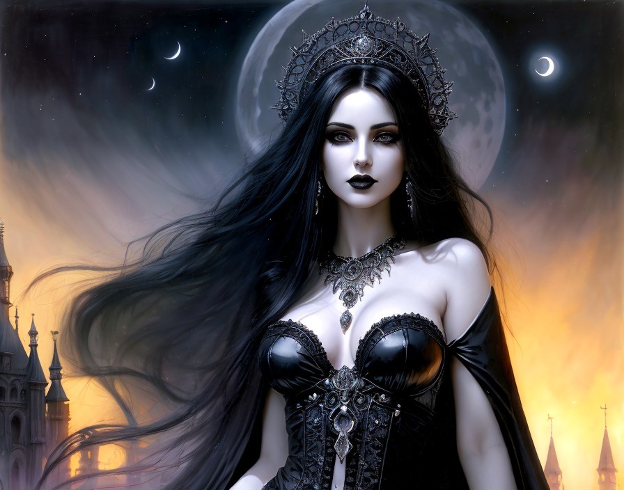 the beautiful sensuous buxom goddess of the night with ultra long black hair, silver eyes, pale skin, full black lips, with gothic black clothing and cape; realistic oil paintings, at night with moon, stars and the obsidian castle in the gothic background, mysterious, Royo, Giger