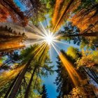 A serene autumn scene features a calm lake reflecting golden sunlight. Trees frame the water, while rays of light illuminate vibrant foliage. A quaint house and boats enhance the tranquil atmosphere.