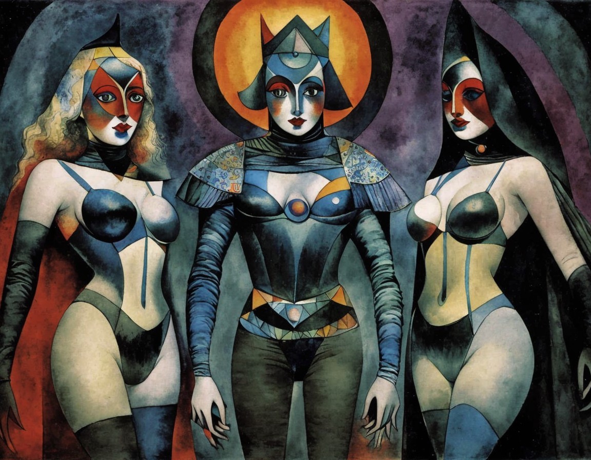 The image features three stylized female figures in striking outfits, blending elements of fantasy and futurism, against a vibrant, circular background that enhances their bold appearance.