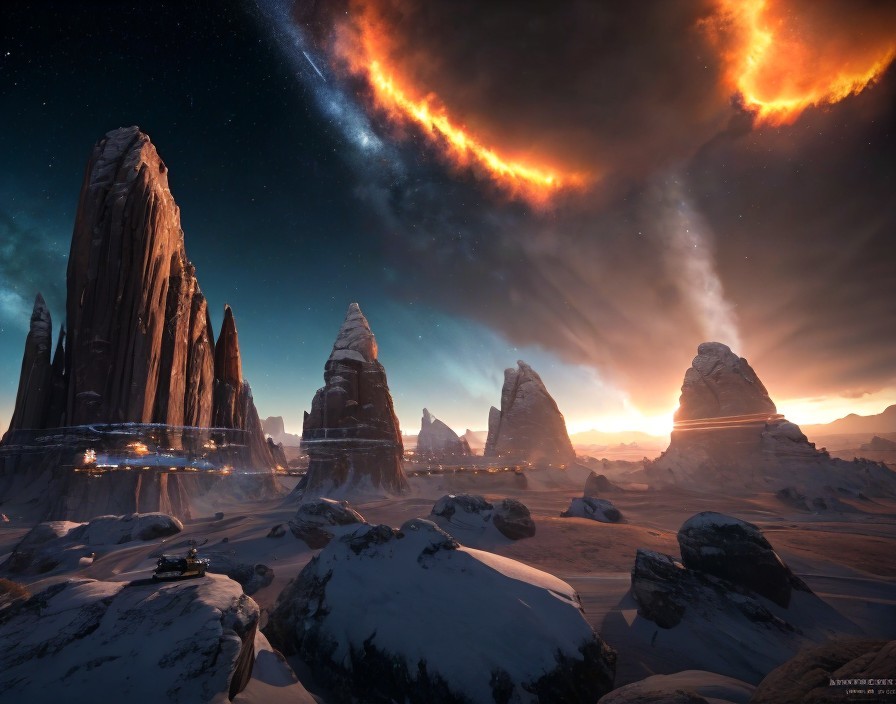 A woman holding a guitar with two more floating, all with cosmic designs, against a surreal backdrop of rocky terrain and a swirling galaxy sky.