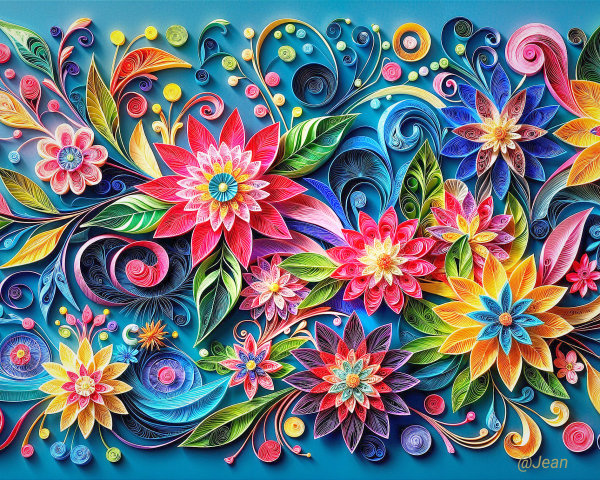 A vibrant landscape filled with a variety of colorful flowers in the foreground, set against a dramatic sunset and silhouetted mountain backdrop. A cathedral spire rises in the distance.