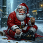 A weathered Santa Claus in a tattered red suit sits on a snowy city street, holding a coffee cup and looking contemplative amidst a bustling, wintery backdrop.