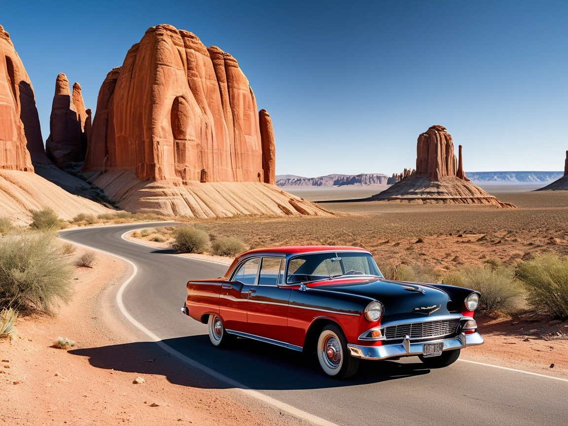 A rugged retro truck adorned with an American flag stands under a glowing moon. It features oversized tires and bright headlights, set against a desert landscape with towering rock formations.