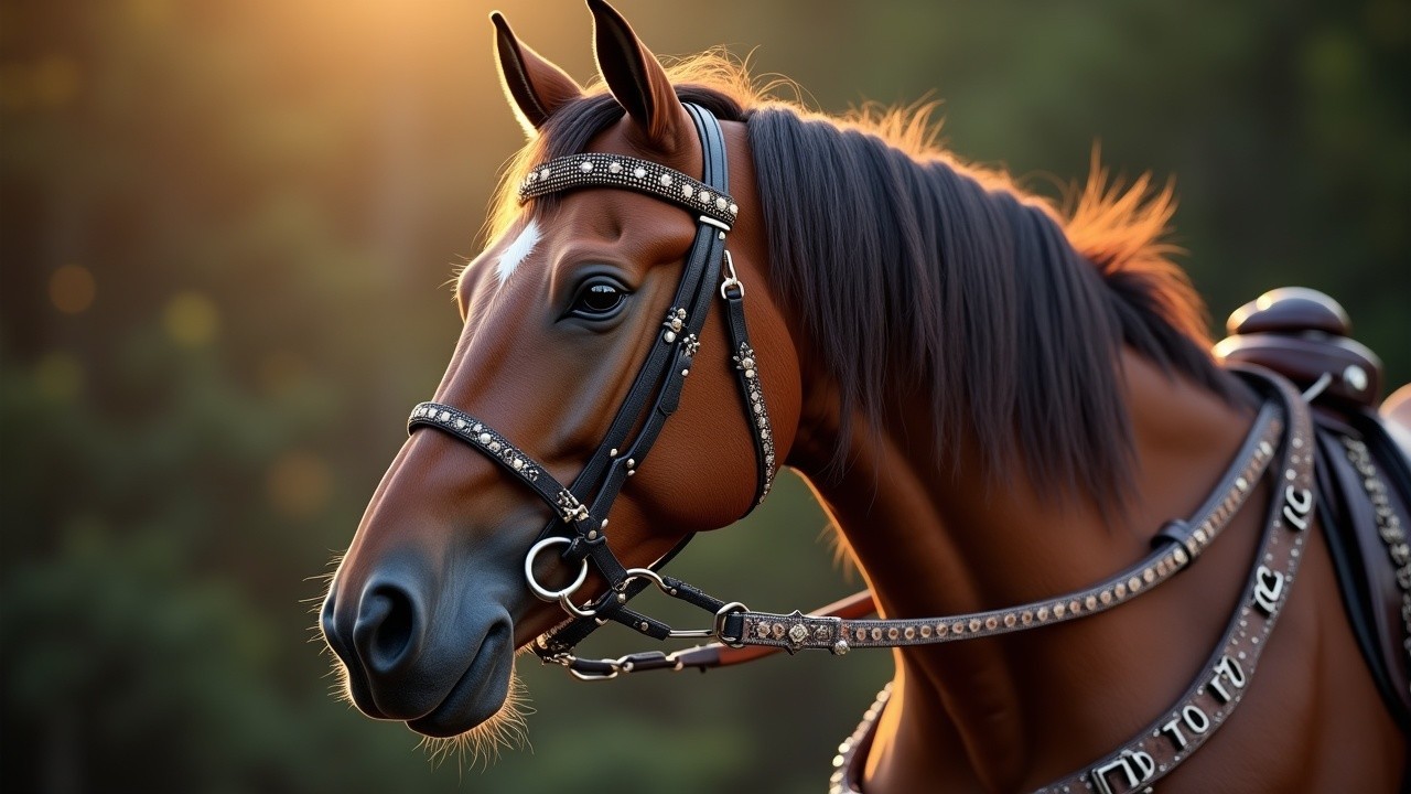 A stunning photorealistic image of a majestic horse adorned with a sparkling, bejeweled bridle. The high dynamic range captures intricate details and vibrant colors, showcasing the horse's elegance.