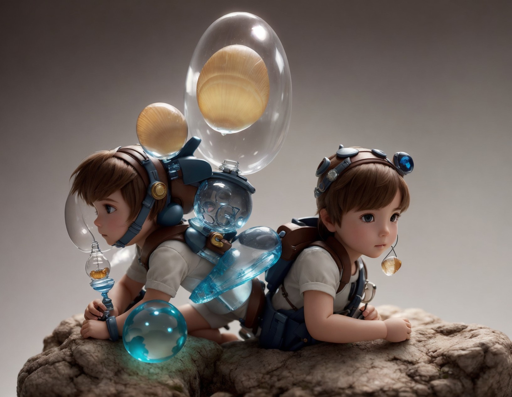 Futuristic astronaut gear: Two animated characters in glass helmets on rocky surface