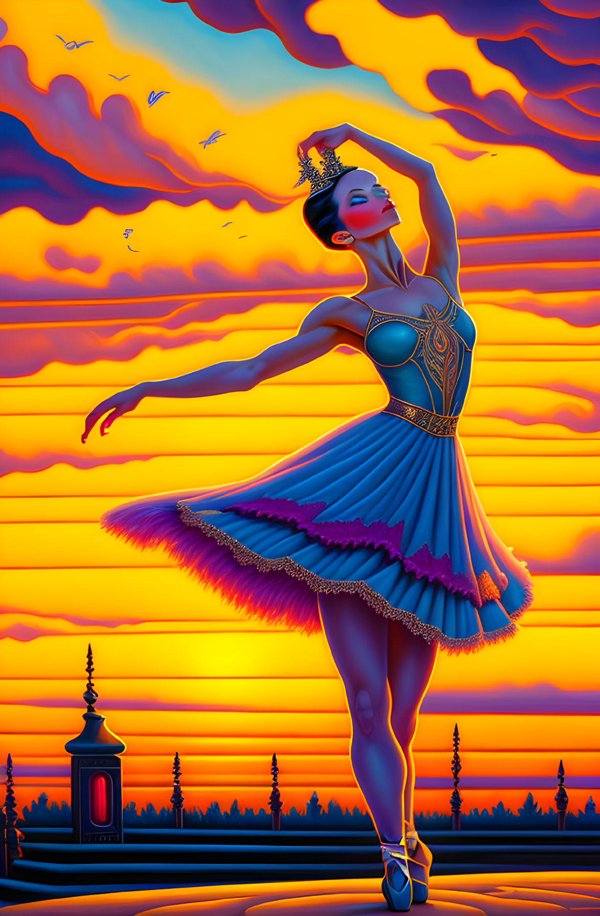A ballerina dances at sunset. the patchwork style of Ivona Lifshes and Catherine Abel. Slender long legs.