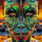 A stunning portrait of a woman with intricate, vibrant body paint resembling nature, featuring colorful patterns and textures. Her captivating eyes reflect a mesmerizing sunset backdrop.