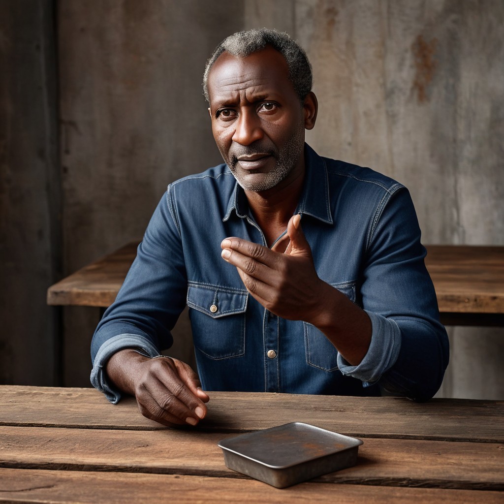 Prompt: "A middle-aged, dark-skinned vendor dressed in simple, casual-style clothes offers a low-quality product at a low price. The product, a tarnished metal object with rusty textures and a matte finish, sits on a worn, deeply grained wooden table. The vendor, with an uncomfortable expression and distrustful gestures, holds the object in both hands, leaning slightly forward to attract the viewer's attention. The scene takes place in a bustling street market, with warm, dim lighting creating deep shadows and sharp contrasts. The background shows worn wooden stalls, messy displays of various products, and people circulating with dynamic movements. HDR lighting and deep, vivid colors, together with detailed textures and sharp contrasts, create a realistic, cinematic atmosphere. The style, inspired by old master painting, combines a rich layer of complex details with hyper-realistic representation, using high-quality rendering techniques such as Unreal Engine and AIVision. The composition focuses on the seller and the product, with a carefully selected perspective that highlights the interaction and the atmosphere of mistrust and expectation."