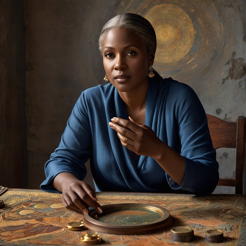 A thoughtful young woman sits at a table filled with colorful paint palettes. She wears a blue shirt and holds a paintbrush, contemplating her next artistic move against a textured backdrop.
