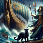 A powerful woman stands on a ship, wielding a trident, with a fierce sea and waves around her. A black cat accompanies her, while a grand ship battles the stormy waters in the background.