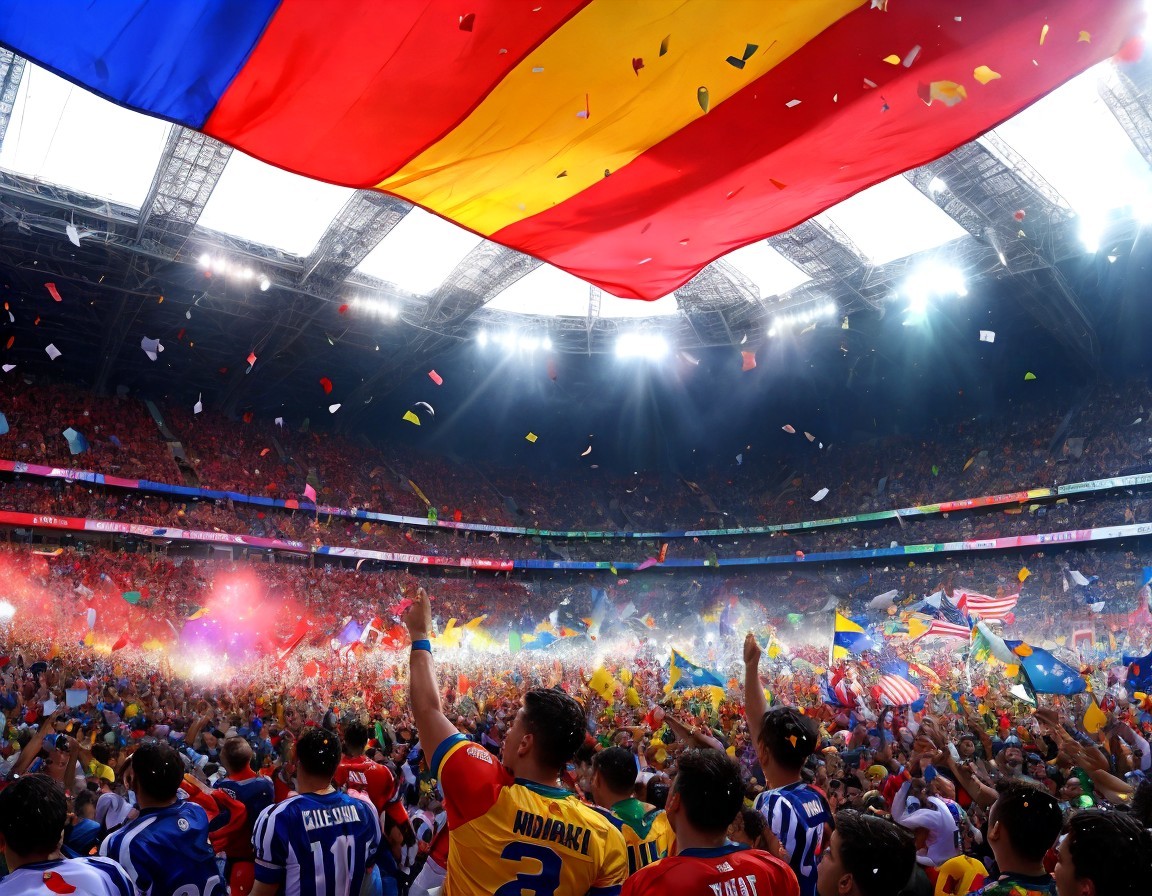 A vibrant stadium with a cheering crowd and a spectacular explosion of colorful confetti in the sky.