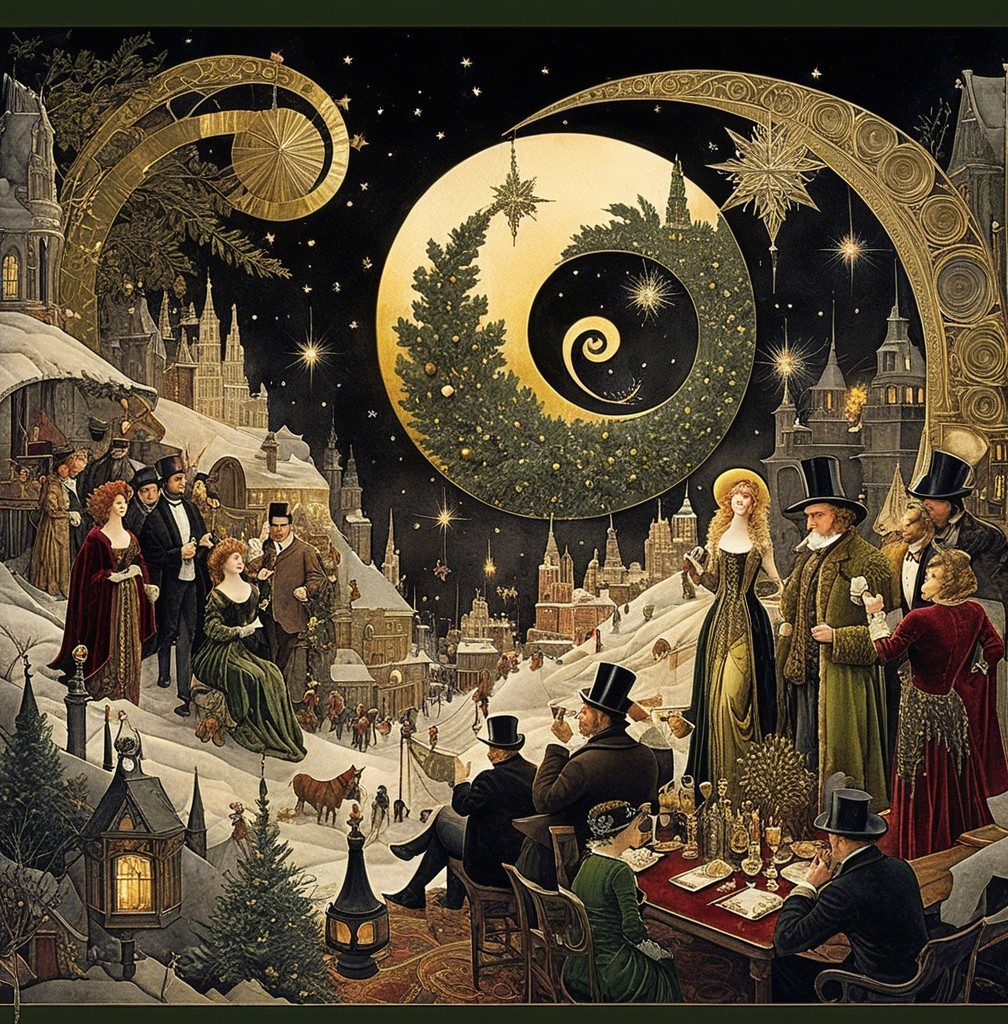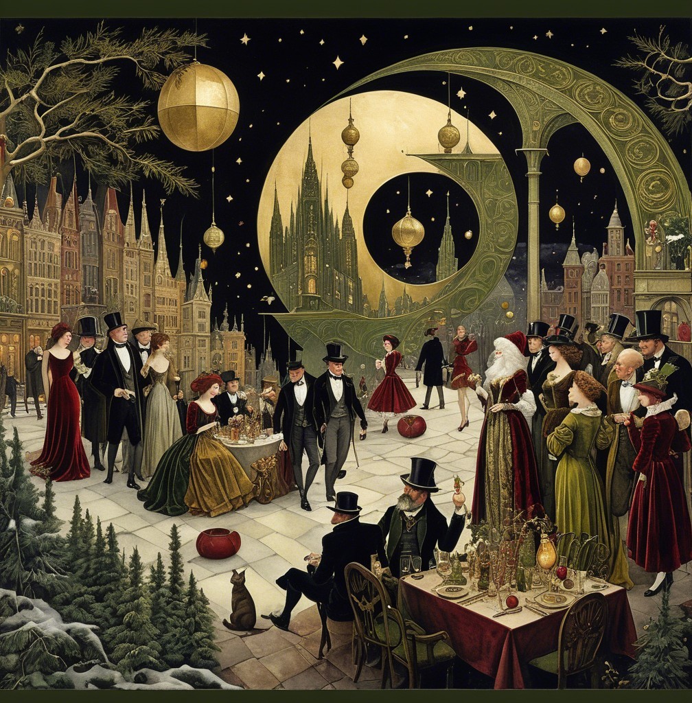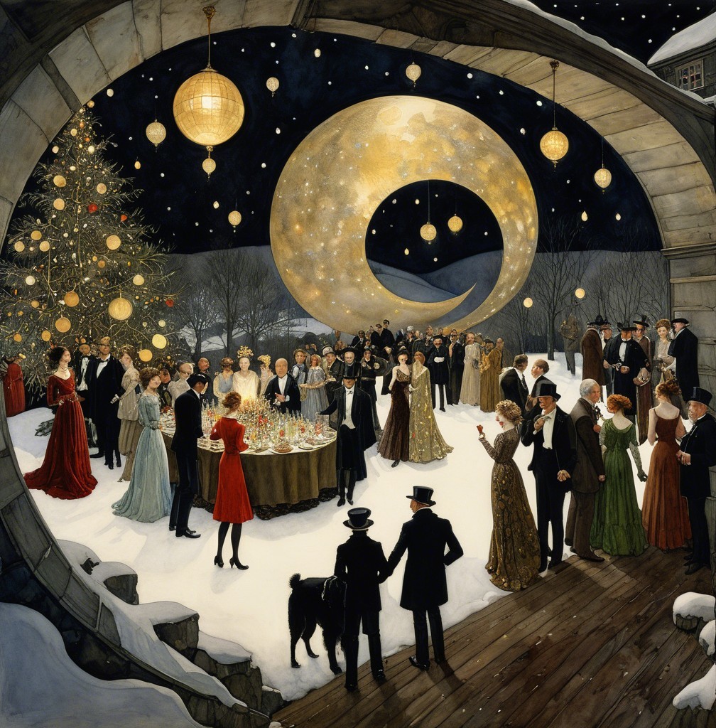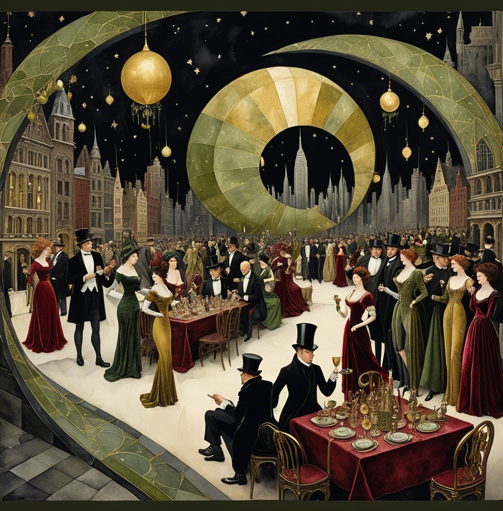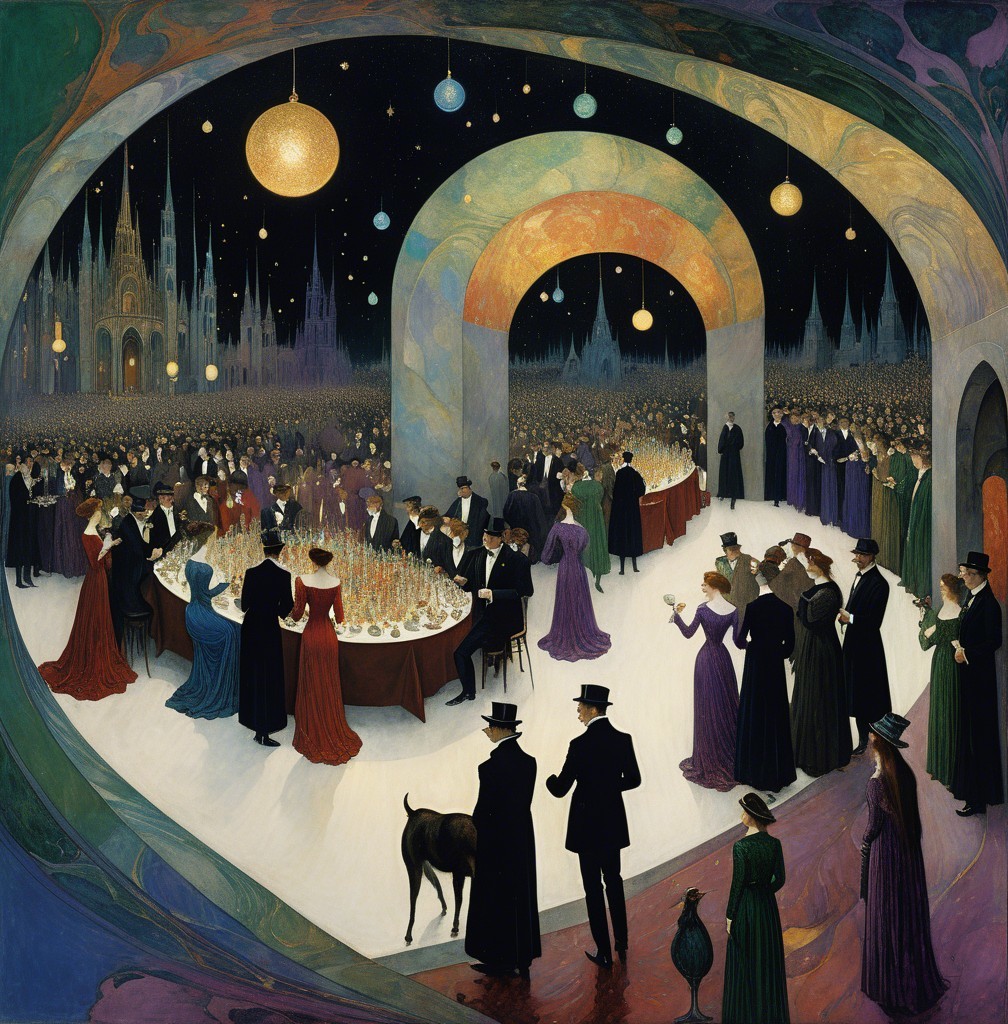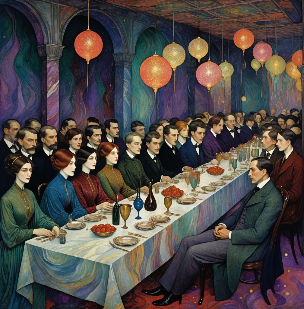 A lavish banquet scene with elegantly dressed men and women seated at a long table, vibrant swirls of color in the background, illuminated by decorative hanging lanterns.