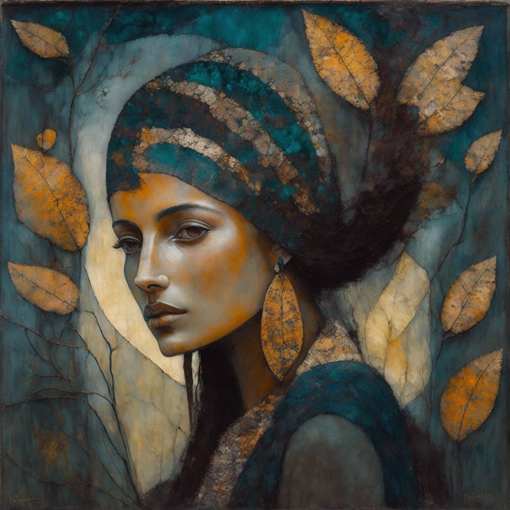 Beautiful woman, portrait in ochre, patina of ancient stone with moss, art brut, moody, somber, desaturated colors, in the style of Paul Klee, Arthur Rackham