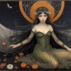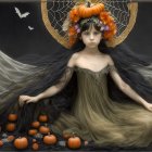 A mystical fairy girl with delicate wings and a pumpkin crown sits among pumpkins in a spooky setting, draped in webs, exuding an enchanting autumn vibe.