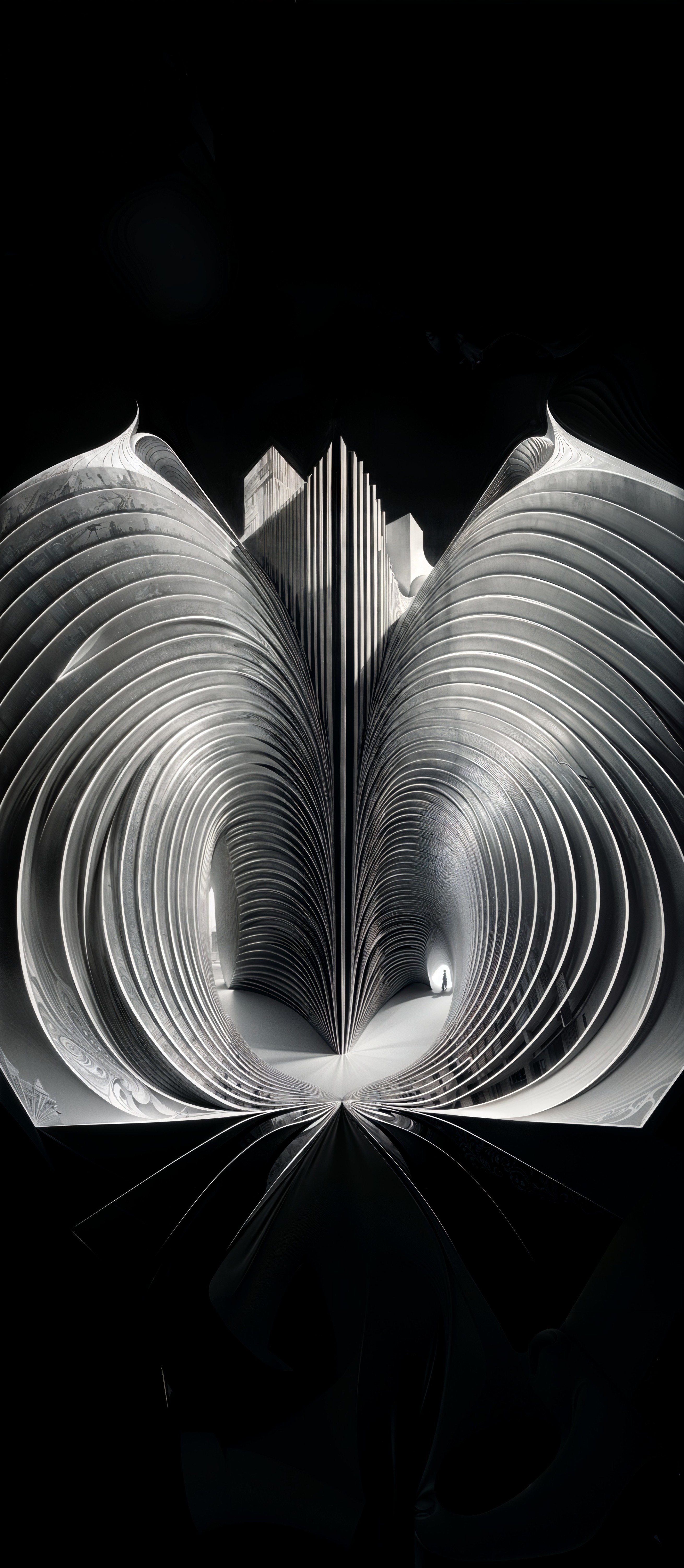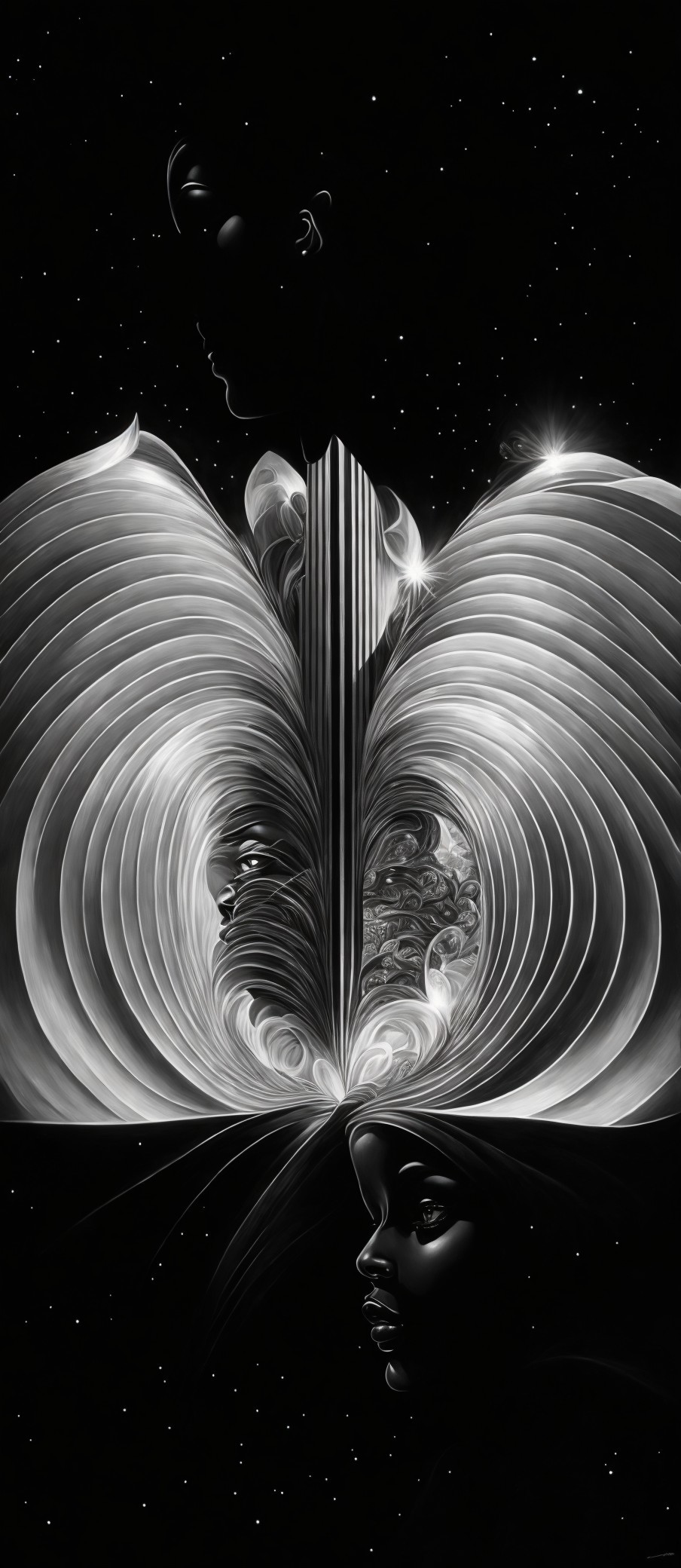 The image features three stylized faces emerging from swirling patterns, set against a starry black background. The composition blends geometric shapes with fluid forms, creating a captivating visual harmony.