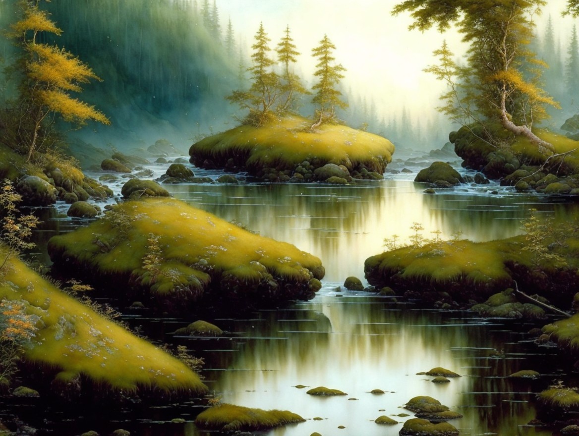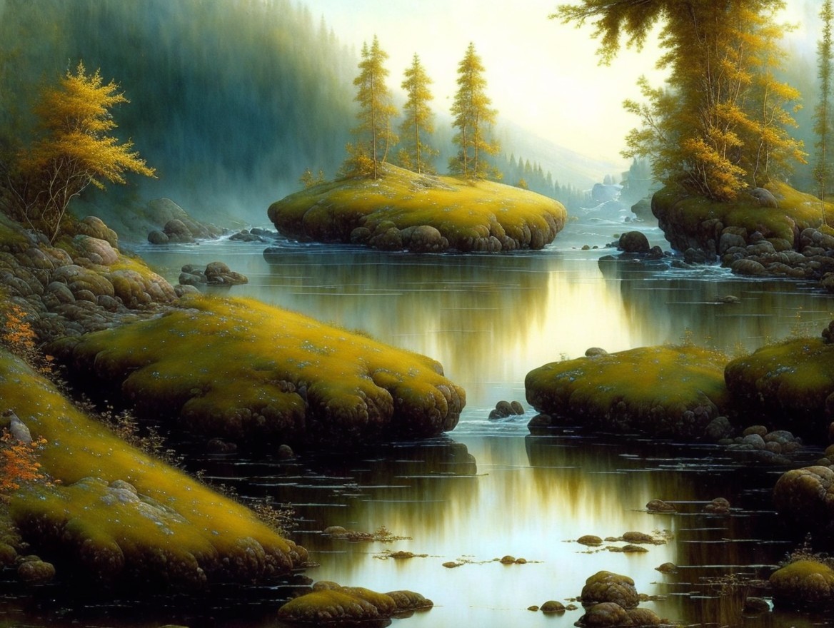 The image depicts a serene landscape featuring gentle hills adorned with greenery, a calm river reflecting the soft light, and scattered trees, all enveloped in a misty atmosphere.