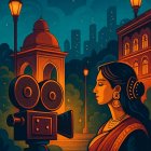 A woman in a traditional saree stands near an old film camera, illuminated by street lamps. The backdrop features illuminated buildings, creating a nostalgic cinematic atmosphere.