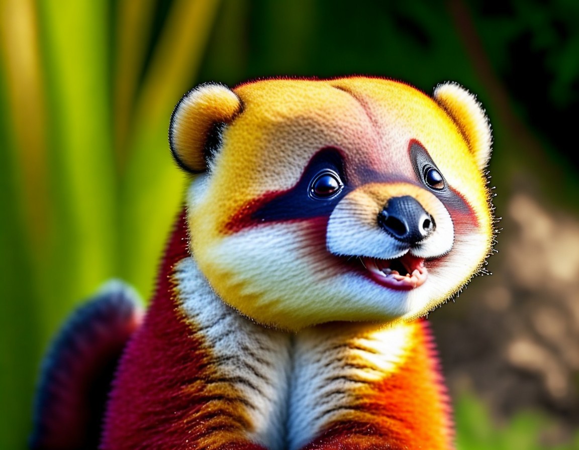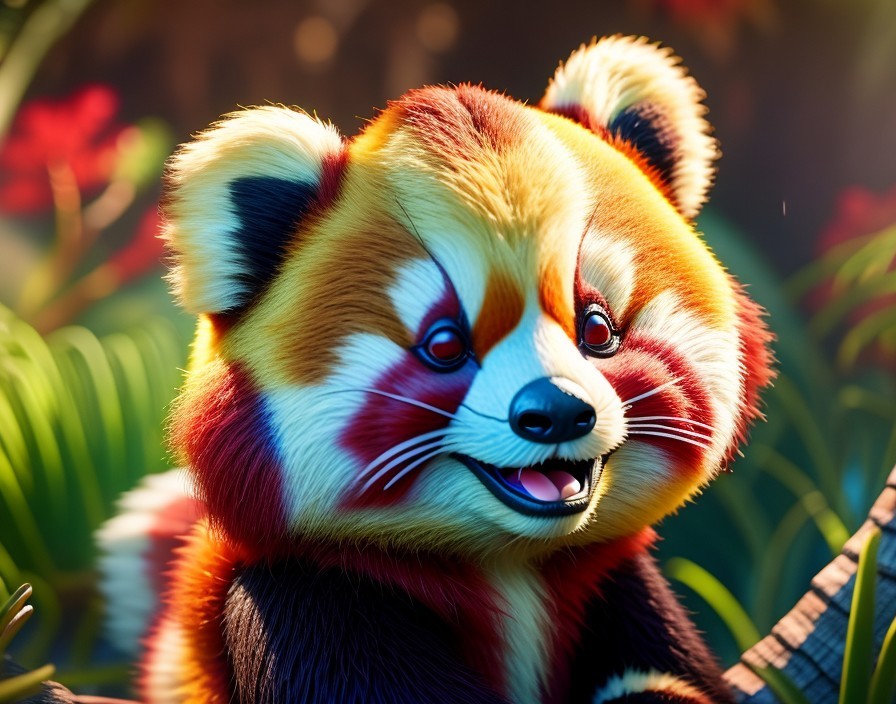 A cute red panda sits on a branch, surrounded by vibrant flowers. Its fluffy orange and black fur and expressive eyes create an adorable and playful atmosphere in a lush, colorful setting.
