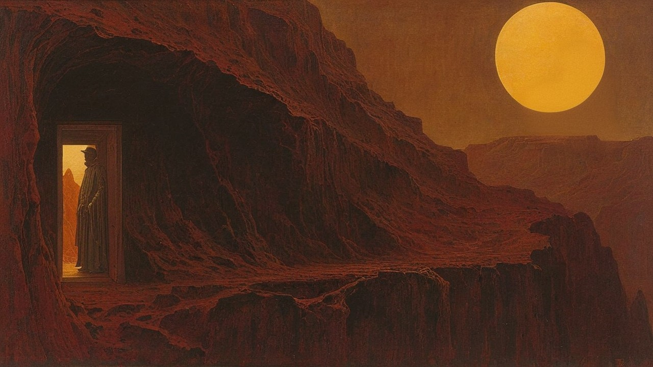Crimson, brass, ochre and sepia colour palette. Imagine it's literally the bestest painting, as if Satan did it.